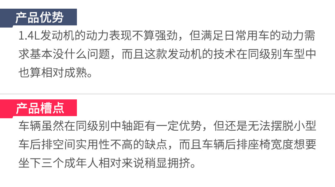 作为一款小型轿车,车辆轴距与改款前一样维持在了2600mm,这样的轴距基本已经达到了紧凑型轿车的门槛。虽然空间方面对于一般的家庭出行来说可能有些勉强,但作为上班族的代步工具,或是1~2个年轻人的日常用车来说已经足够了。