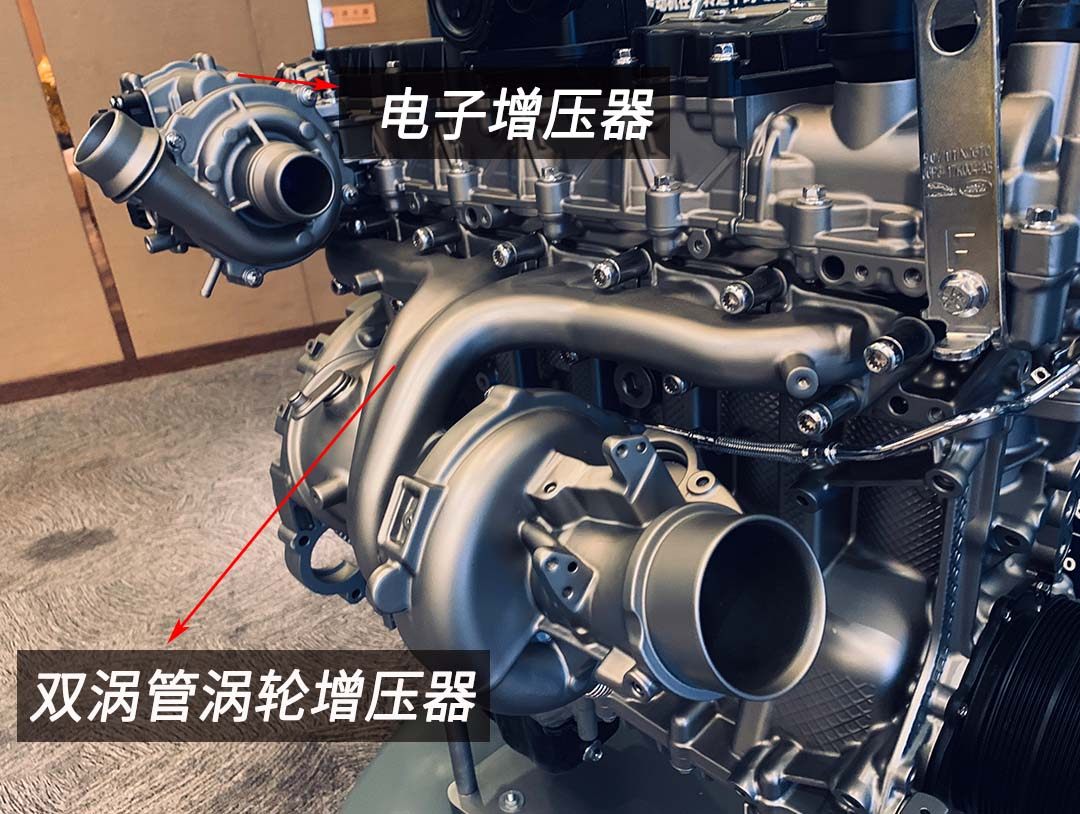 发动机采用了电子增压(机械增压)器和涡轮增压器串联的双增压模式。其中涡轮增压器采用了双涡管设计,优点是可以避免相邻气缸之间相互影响,提升发动机燃烧效率;而电子增压器直接由48伏电动机直接驱动,有效改善低速时传统涡轮增压介入不明显,动力输出弱,涡轮迟滞等问题。