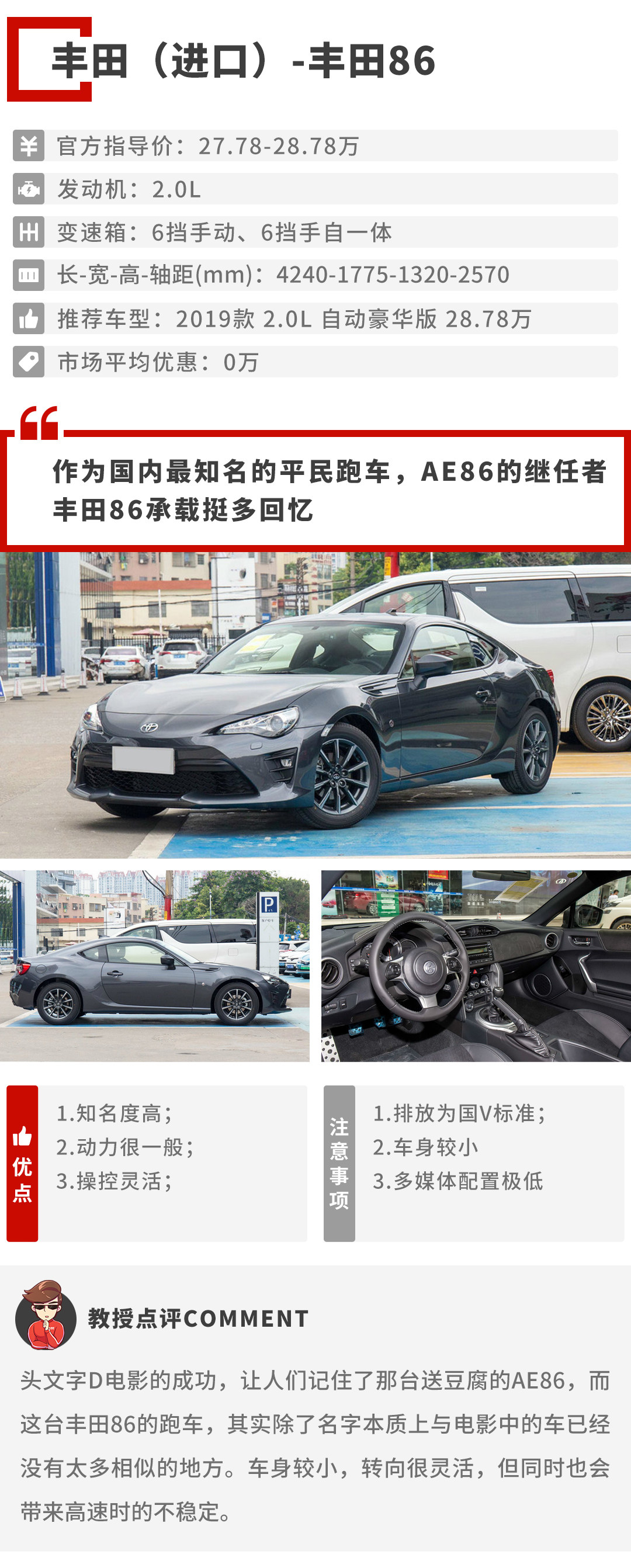 跑车是属于年轻人的大玩具,而上面这几款平民跑车,相对几百万的高级跑车来说,价格更加亲民,普通人咬咬牙也能拿下。
