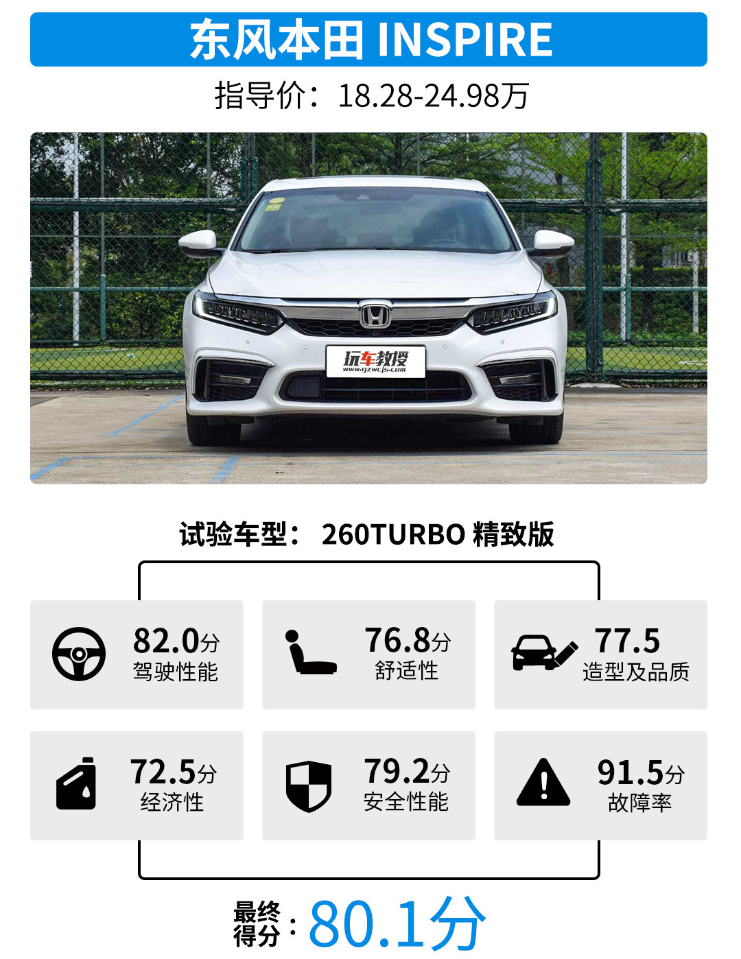 车型点评:作为雅阁的兄弟车型,东风本田 INSPIRE在市场上的认知度并没有那么高。但在该评测环节中,车型具备着不俗的实力。从具体情况来看,INSPIRE的驾驶环节方面较为突出,尤其在振动舒适性上,能够给予消费者比较满意的交代。另外,得益于车型前排双层玻璃的加入,车型在静谧性上也有一定程度的优化。而论起缺点,车型的内饰质感有待加强,尤其在气味上,表现不佳。但不管怎么说,综合实力依旧给到较高的分值。