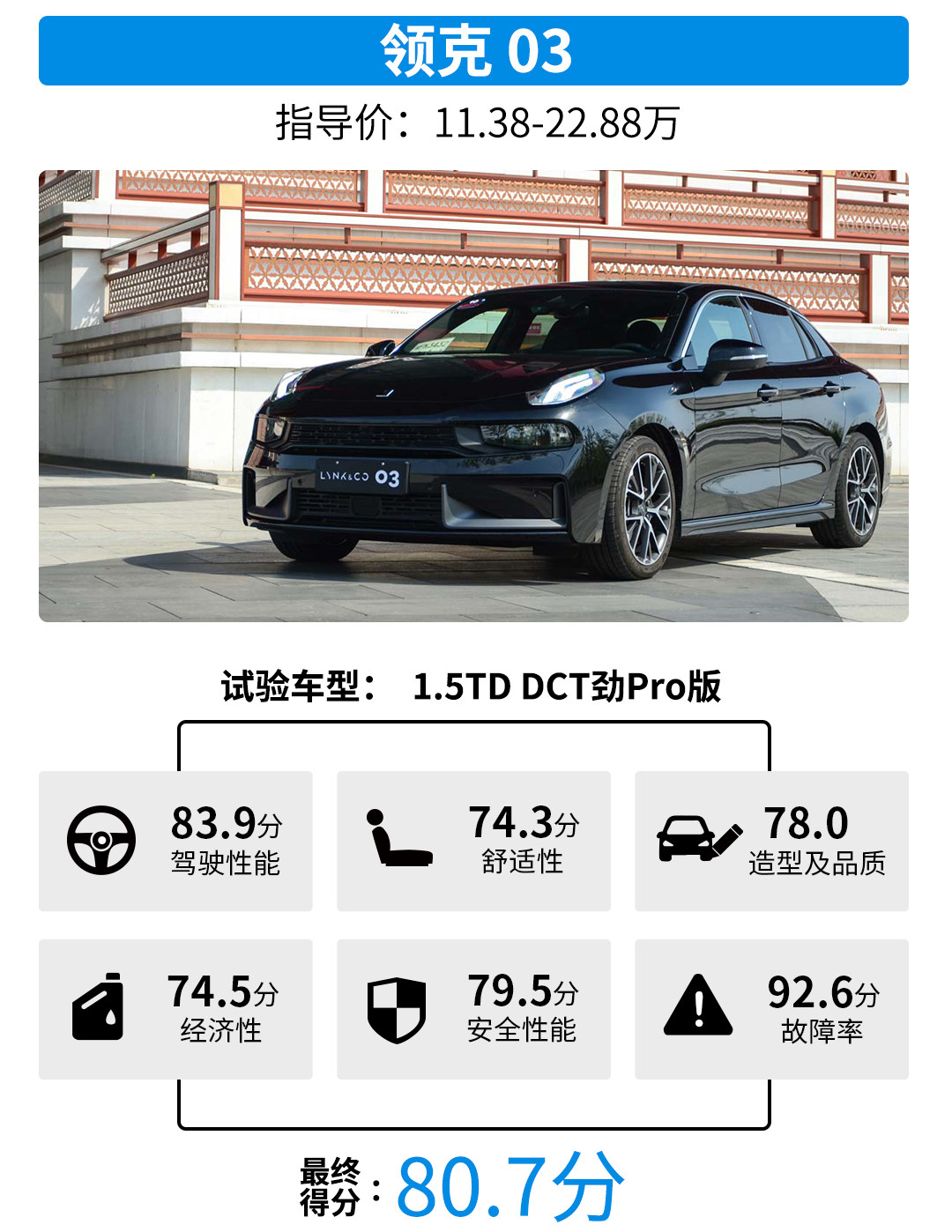 车型点评:领克,作为中国豪华品牌的代表之一,自面世以来便有较高的关注度,但高端的定位也让其销量并未达到预期,起码比起WEY刚推出那会VV7、VV5动辄过万的成绩来说的确有些不够看。而领克03,应该算是领克目前最好卖的车型了。在本次CCRT的实际试验当中,领克03在驾驶方面相对来说较为不错,在直线加速能力和制动性方面都有不错的实际表现,但在感知安全和转向操控上有待提升。过于个性的外观显然有利有弊,在消费者上则会出现“接受”与“不接受”两种截然不同的的态度。而论起缺点,领克03在经济性方面有待提升。其次,车内空间表现比较一般,偏运动化的车型设定让驾乘者在舒适性有了些妥协。另外,值得一提的是,领克03的故障率分值也比较高。