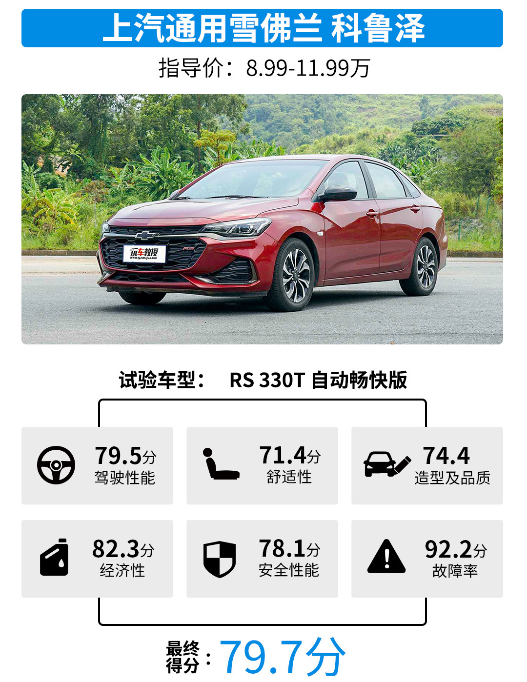 车型点评:科鲁泽,一经推出就爆红,在上市首月更是有着2万辆的绝好成绩。新车爆红的很大原因在于性价比,车型售价8.99-11.99万,且有不错的市场优惠政策。在本次CCRT的实际试验当中,由于1.0T及1.3T小排量涡轮增压发动机的匹配,科鲁泽的油耗经济性获得消费者实际好评。而在驾驶方面,同级别中少有的多连杆独立后悬架,便为科鲁泽的驾驶稳定及舒适性起到添砖加瓦的作用,另外再加上稍微激进的动力调校,车型整体驾驶偏向更加符合时下消费者。不过,因为车型的价格限制,虽然有着较为运动的外观,但车型的内外设计便没有做得更加精致。相比之下,较为亲民的价格,也许更加讨部分消费的喜爱。