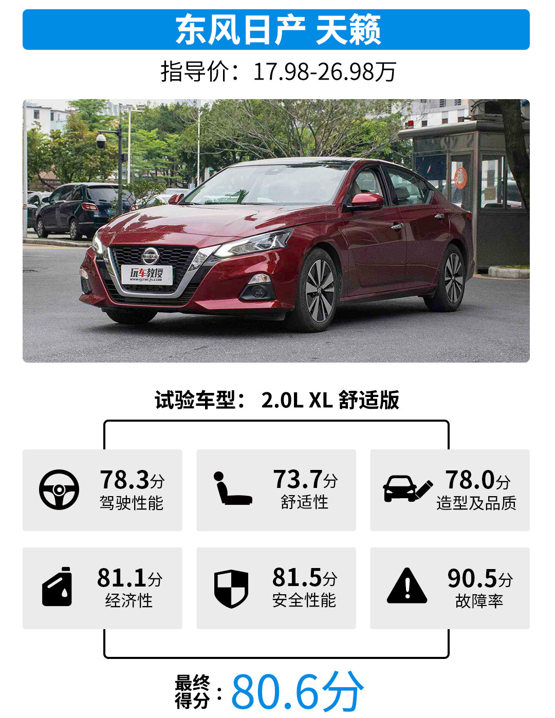 车型点评:全新天籁,有了更加年轻运动的面貌。在本次CCRT的实际评选当中,天籁在驾驶方面都有不俗的表现,灯光照明及油耗经济性都值得一提。虽然本次测试车型为2.0L车型,但不论是2.0L车型还是2.0T车型,全新天籁在油耗经济性的表现最突出。前者2.0L自吸发动机任劳任怨,后者2.0T VC-TURBO可变压缩比发动机,其压缩比更可以在8~14之间进行无级变化,根据不同发动机工况进行动力输出,获得更加优异的动力输出的同时,也能改善油耗的经济性。而在缺点方面上,天籁的转向操控方面有待提高。