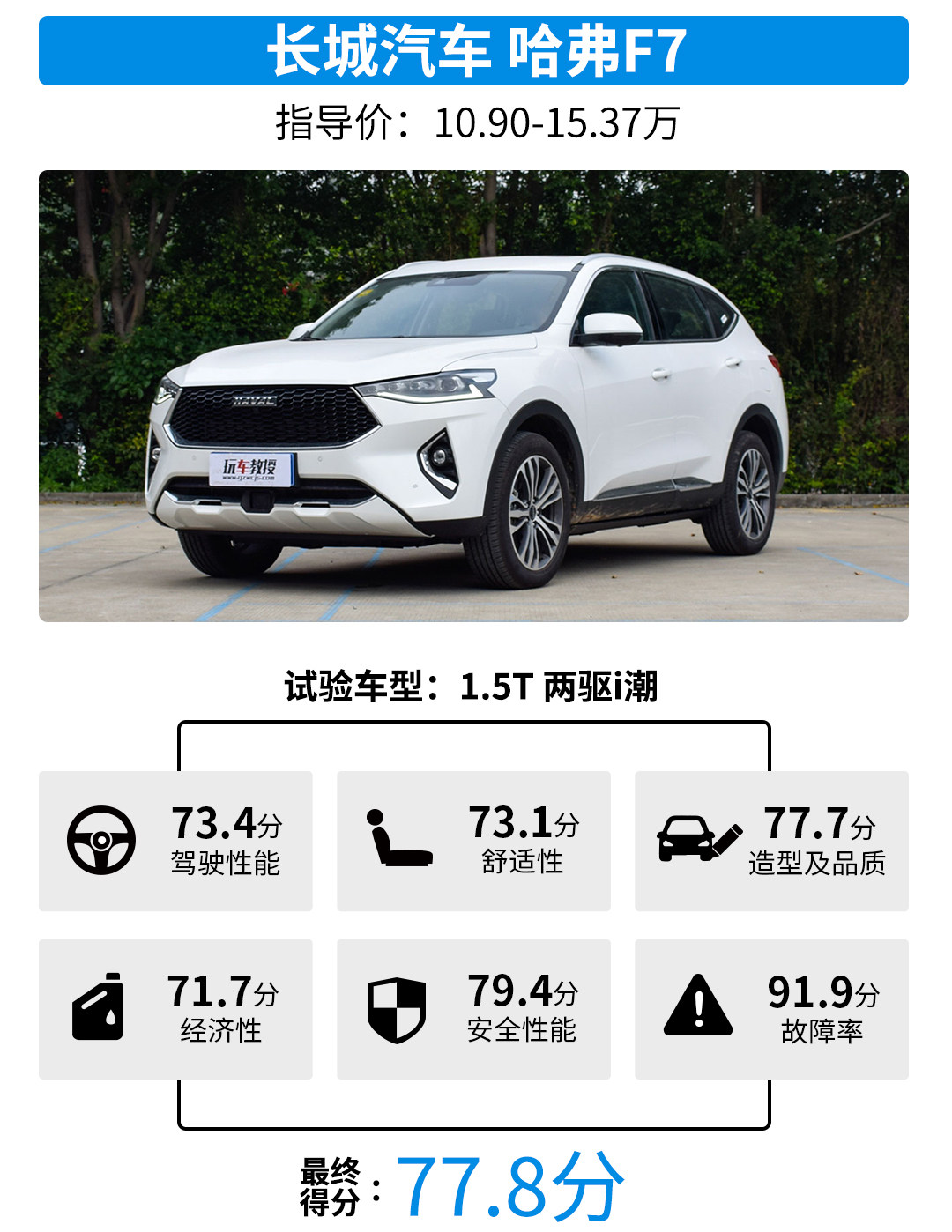 车型点评:哈弗 F7,作为除哈弗H6的第二款热销车型,虽以H6为基础,但车型的精致化这一差异得到了广大消费者的认可,尤其在内饰上的用心,给予了消费者更加舒适的驾乘环境。在实际的表现环节中,整体的安全性能也有不错的表现,有着79.4分较高的安全成绩。不过,值得注意的是,车型在后期的养车成本会偏大些,制动性能也有待优化。77.8的整体得分,与80分还尚有一些差距,表明了虽国产品牌在近些年有较大的进步,但向上的提升空间还有待挖掘。