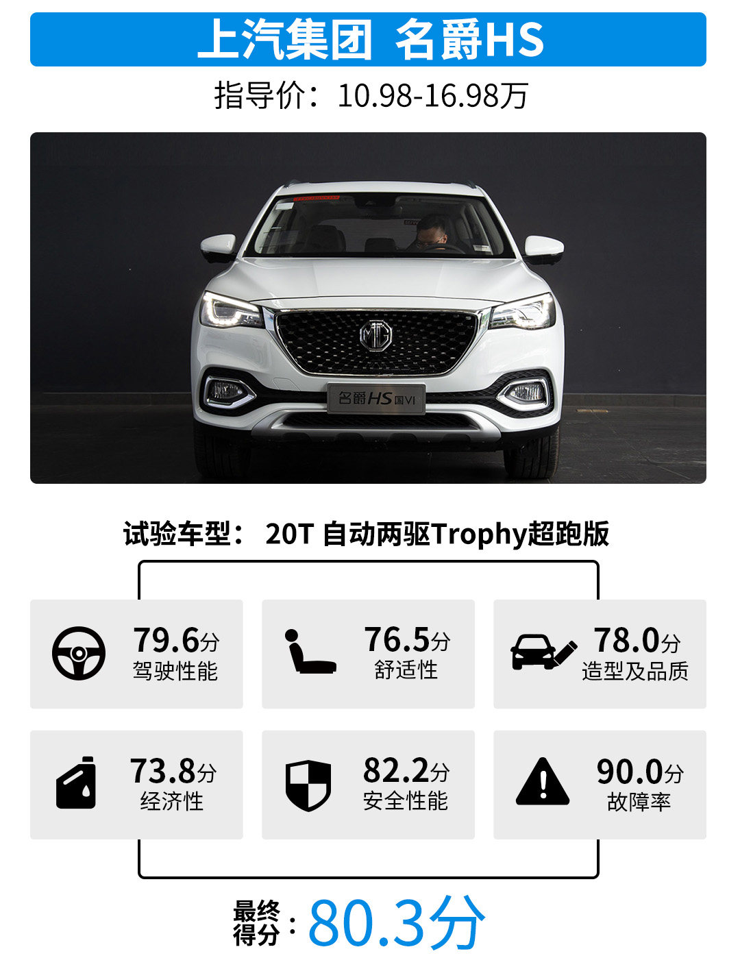车型点评: 在本次CCRT中的具体表现中,名爵HS在安全性能最为突出,与速腾一样有着82.2分较高的得分成绩,也是本次8款试验车型中安全性能细分领域得分最高的车型了。名爵HS车内空间的评价结果不俗,而振动舒适性表现尚可,无论是驾驶者还是乘坐者,都给予了较高的舒适性。而在缺点方面上,名爵HS在油耗经济性、人机工程学、气味舒适性上有更大的提升空间。但从整体来看,80.3分的综合得分表明名爵HS有着较为综合的实力。