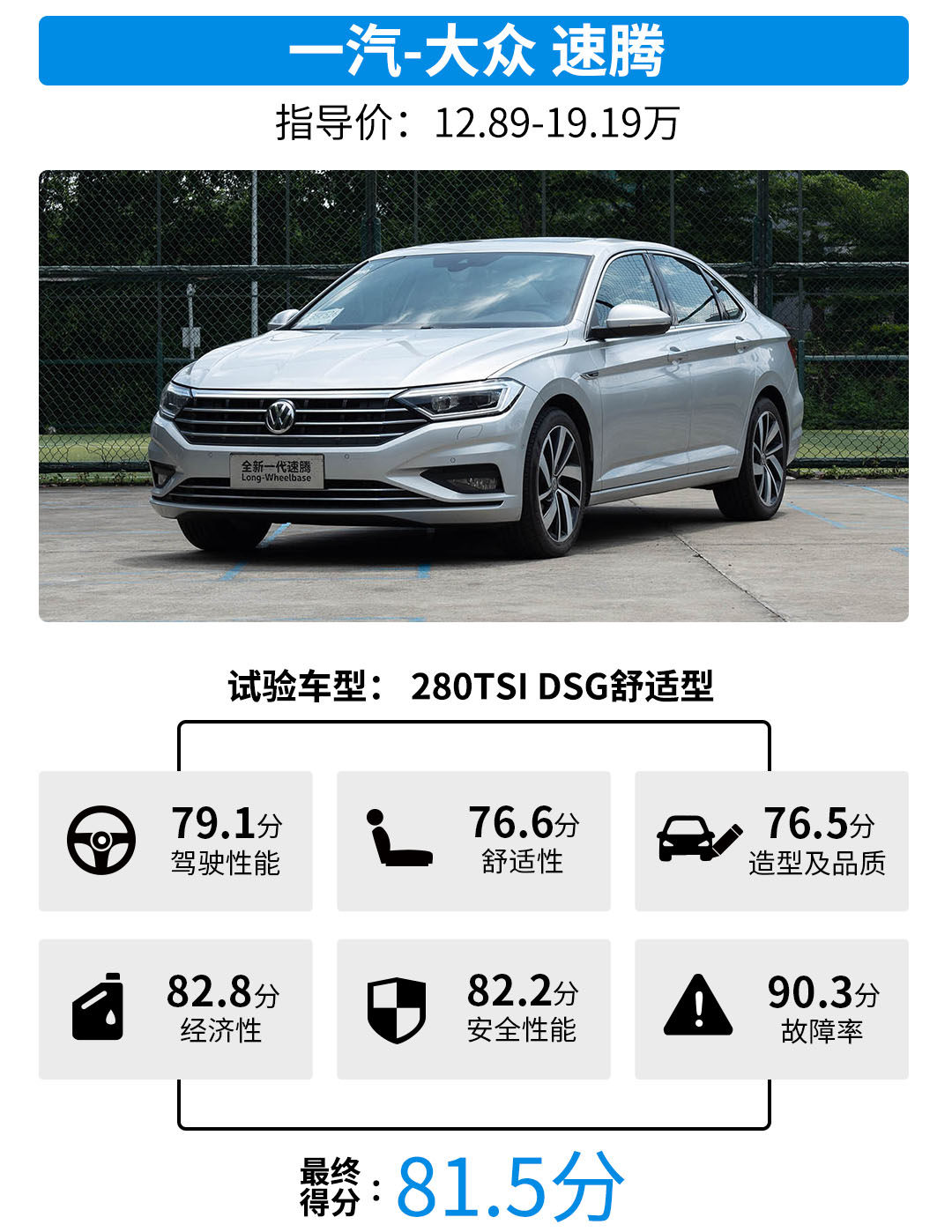 车型点评:基于大众MQB平台打造,新速腾有了更好的底子。从具体情况来看的话,速腾在驾驶性、经济性以及安全性能表现较为突出,尤其是在经济性上,有着82.8分较高成绩。目前,速腾在动力上有1.2T和1.4T两款发动机,且发动机为大众集团EA211系列,成熟可靠,被旗下多款车型运用。再配合大众DSG变速箱,动力输出性能及油耗经济性更有保障,实际驾驶的油耗水平与官方宣称的5.4-5.7L/100km综合油耗相差不大。另外,车型在振动上的抑制也很有成效。不过由于大众套娃式的内外设计风格,其设计方面会让部分消费者有些审美疲劳。同时,车型在人机工程学上也有待优化。虽说如此,但81.5分的综合得分,使得速腾成为本批车型中得分最高的车型。