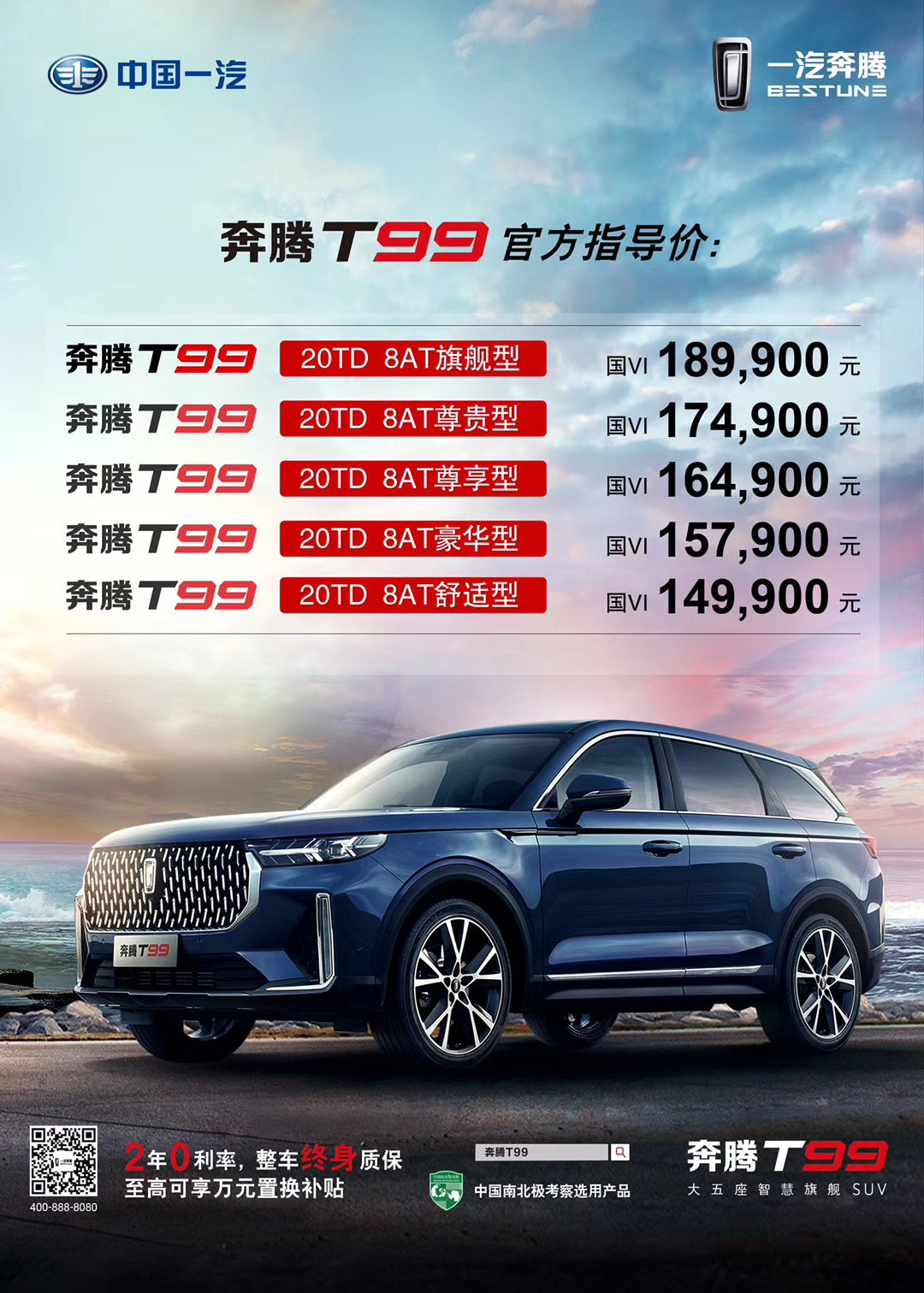 11月1日,一汽奔腾的首款中大型SUV——奔腾T99正式上市,共推出5款车型。新车作为奔腾的旗舰车型,延续了光影折学的外观设计理念。车身整体线条方正硬朗,雨滴式的进气格栅与车标相融,精致而有立体感。横平竖直的大灯组与镀铬装饰条搭配,让前脸显得更加宽阔。内饰上,最亮眼的就是车内“7”字形的三块大尺寸屏幕,分别为全液晶仪表、中控液晶屏以及挡把前方负责空调等操控的屏幕,这样的设计不仅减少了大量的实体按键,也让该车的科技感有了明显的提升。动力上,新车将搭载一台由中国第一汽车集团有限公司生产型号为CA4GC20TD-32的2.0T涡轮增压发动机,其最大功率为224马力。传动系统,新车匹配的是盛瑞第二代8速自动变速箱,未来还将提供爱信6速自动变速箱可选。这款品牌旗舰产品是你的菜吗?