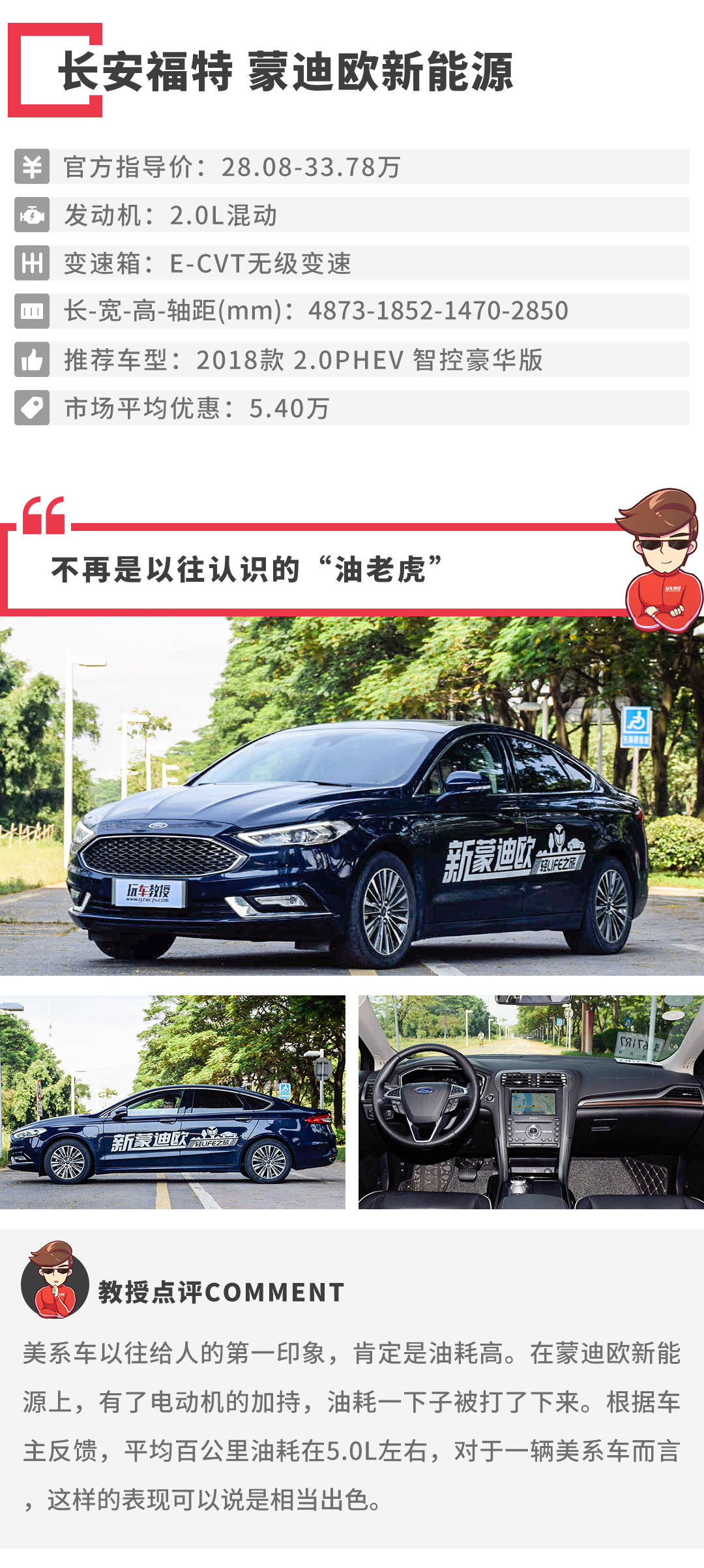 美系车给大家最大的印象是什么?相信不用你们说,教授也能猜到,肯定是油耗巨高。这一问题,也是不少喜欢美系车消费者,却又不敢购买的一大因素。但相信,福特蒙迪欧新能源在这个问题上面,你会对美系车有着颠覆性的认识。同样,也是2.0L自然吸气发动机,加上混合动力系统,并且还是插电式混合动力。在电池满电的状态下,纯电续航里程可以达到52Km。满足一般上下班,相信并无难度。