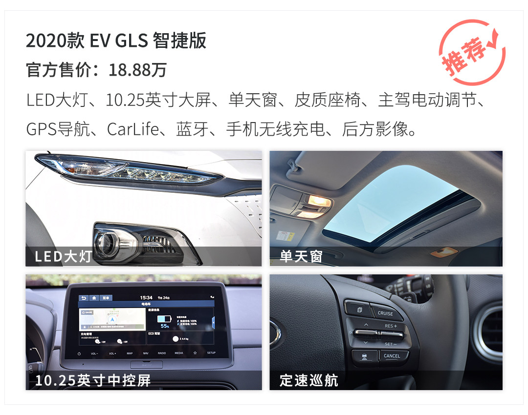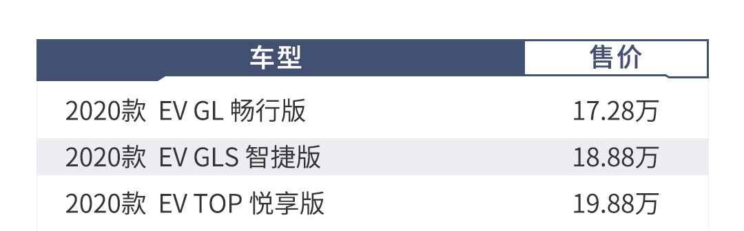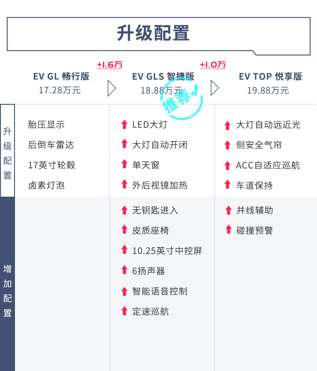 EV GL畅行版增加1.6万元后,整体配置得到提升,包括皮质座椅、10.25英寸中控屏和定速巡航等配置全都有。如果对于主动安全配置像车道保持、碰撞预警等需求不大,那么直接选择中配18.88万元的EV GLS智捷版即可。而顶配版虽然包含了更多的驾驶辅助功能,但是将近20万元的车价竞争力并不大。