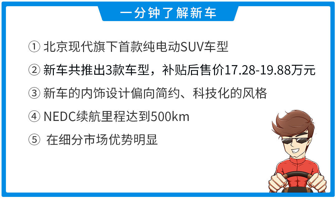 昂希诺纯电动定位为纯电动小型SUV,是北京现代旗下首款纯电动SUV车型,新车基于燃油版车型打造而来。外观上,昂希诺纯电动大体上保留了其燃油版车型的设计,另外在多处细节部分融入了新能源元素。新车采用分体式大灯设计,上方大灯呈“剑眉”状,集成了日间行车灯和转向灯,细长的镀鉻条将两侧的上方大灯以及车标连接到一起,整体感很好。下方大灯则为梯形造型,内置远近光灯。昂希诺纯电动前脸采用封闭式前格栅设计,辅以点阵式纹理图案进行修饰,不过我个人对这个设计并不感冒,用我自己的话描述就是“;灵感来源于簸箕”......视觉效果很粗糙,毫无美感可言。