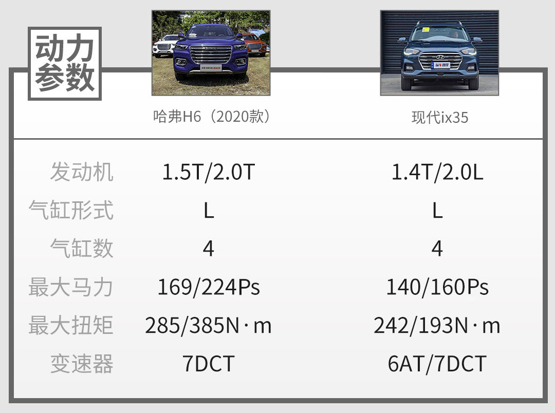 2020款哈弗H6的产品线已经精简了不少,目前只有7款车型,搭载1.5T/2.0T发动机和7挡双离合变速箱。而ix35最大的优势也是在这,在起亚K5、索纳塔上服役多年的Theta—II 2.0L发动机成熟可靠,还搭载6AT变速箱。