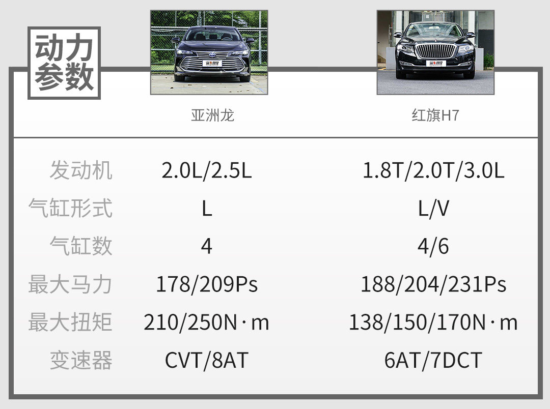 动力方面,H7主力车型采用的是1.8T/2.0T涡轮增压发动机,而亚洲龙汽油版采用的是2.0L/2.5L自吸发动机。