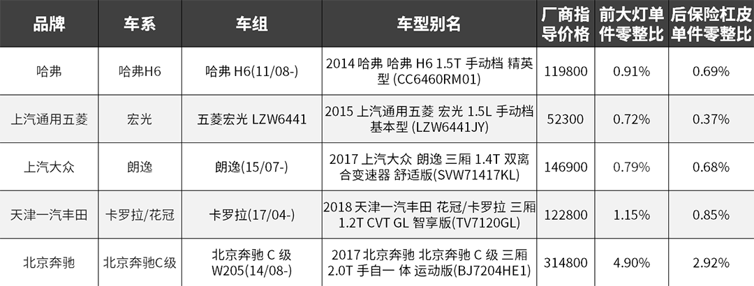 除了整车零整比以外,榜单中还公布了车辆最易损件:前大灯以及后保险杠皮的单件零整比。