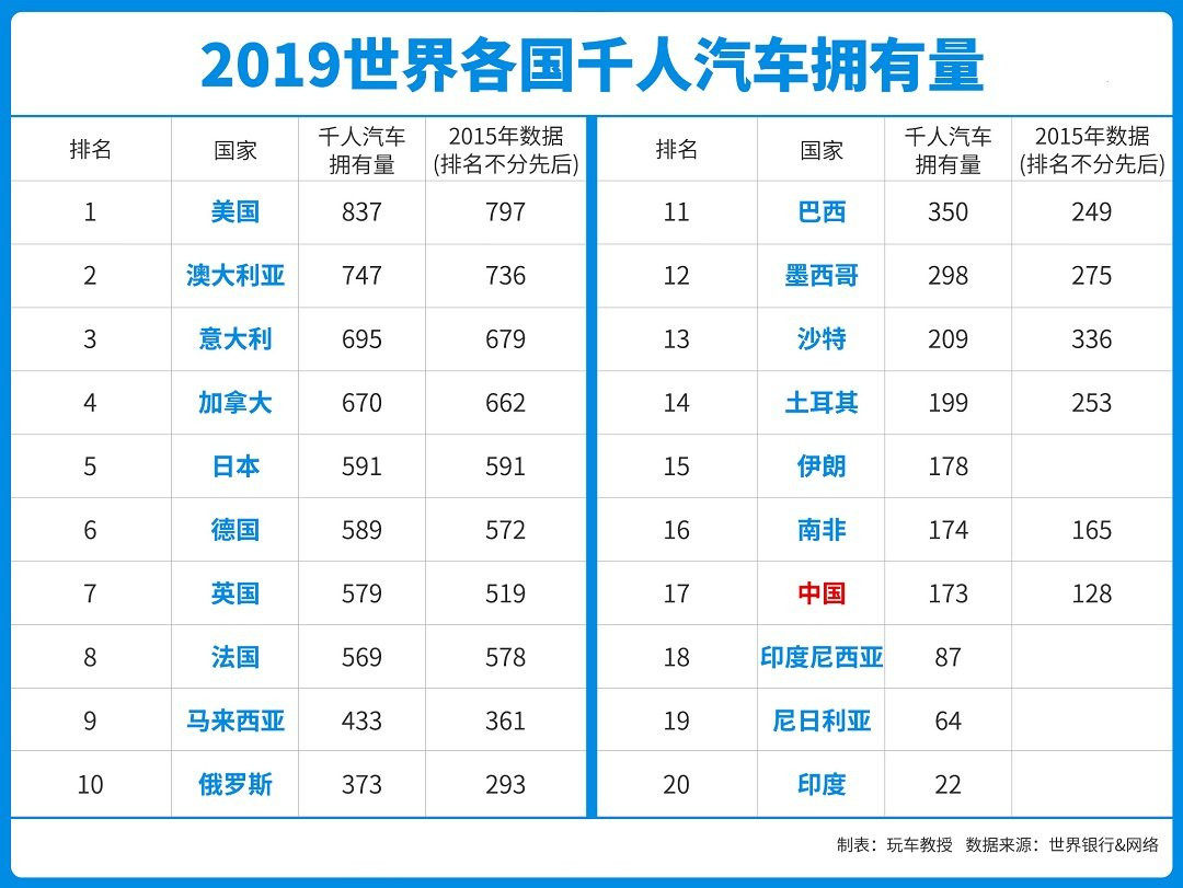 车市28年来的首度负增长,是车市回归理性的信号,但并不代表中国车市向上通道就此关闭。近期,世界银行公布了一份关于全球20个主要国家千人汽车拥有量的报告,从报告中可以清晰看到,中国的千人拥车量仅为173,约为美国的1/5。