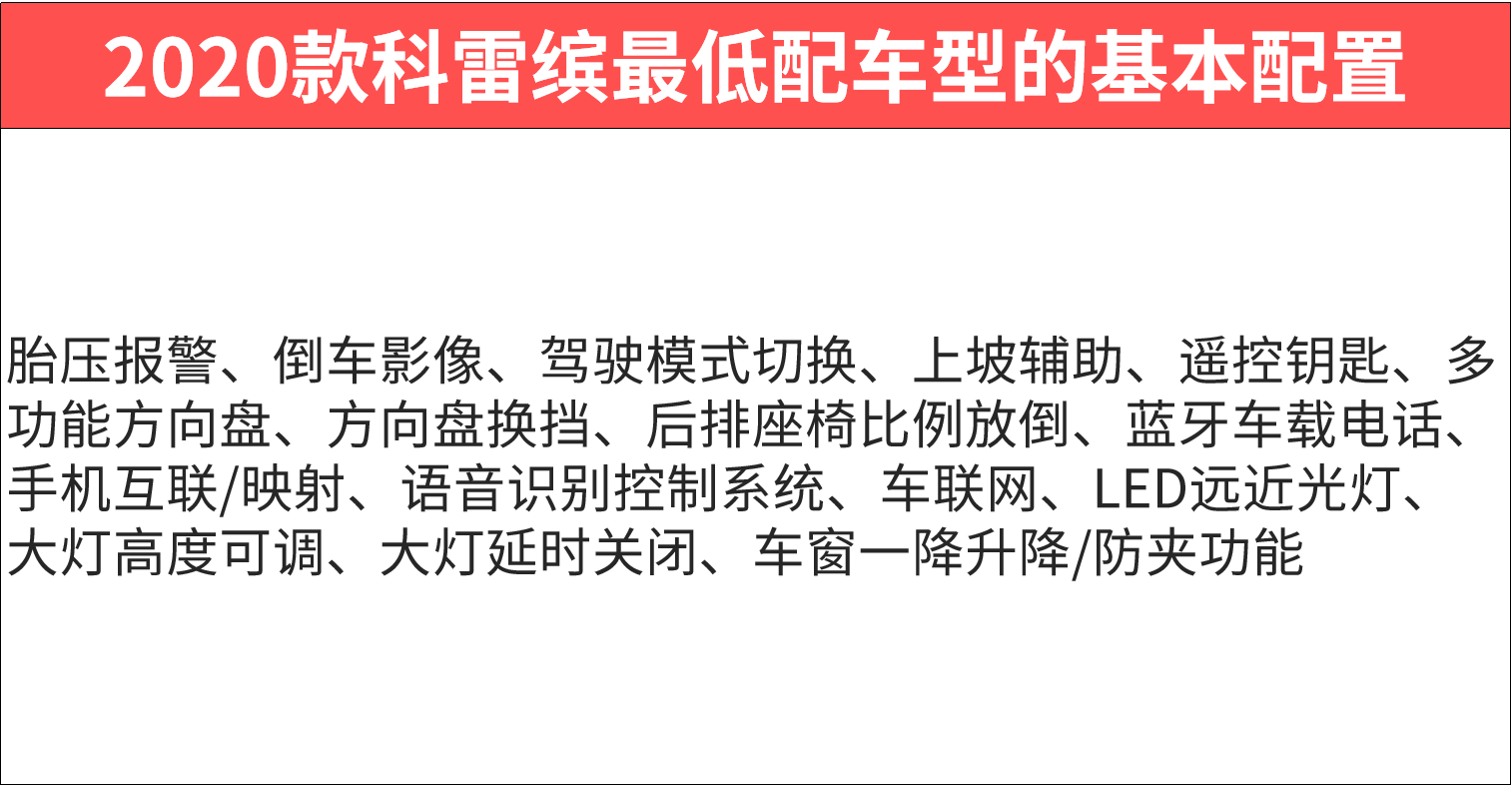 科雷缤乞丐版的配置相对没有那么丰富,一些便利性及安全性有所缺失。但在灯光上,科雷缤的配置匹配相对会比较讨喜,LED较为主流的灯光光源均出现售价最低车的车型上,且其它功能也比较齐全。