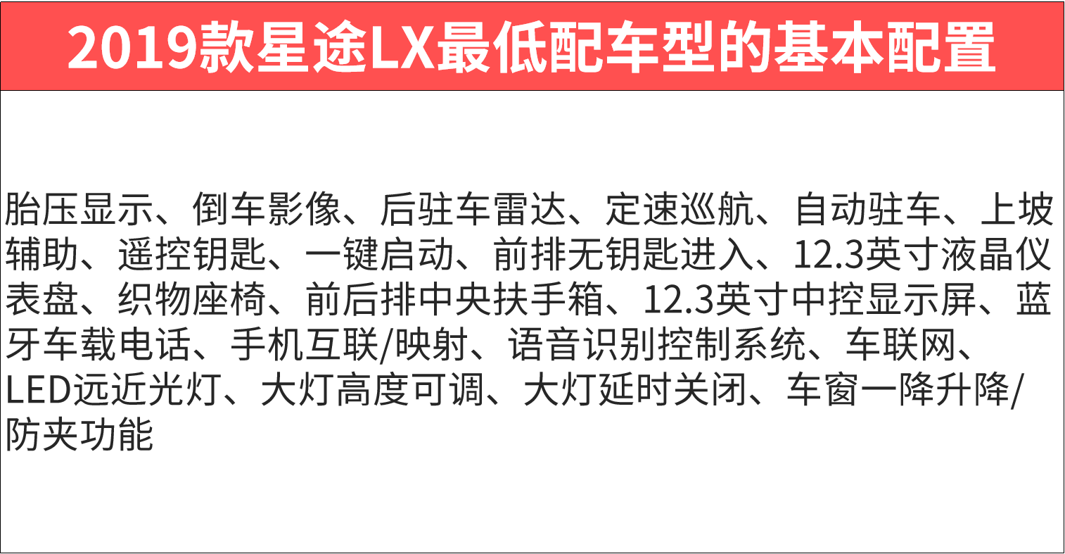 星途LX的乞丐版值得选择,一些基础性配置都比较齐,对于绝大部分消费者而言,足以满足日常实际用车需求。对于那些追求舒适性、安全性更高的消费者而言,教授还是比较推荐第二个配置车型,比如有主动刹车/主动安全系统以及自适应巡航系统,无论是便利性,还是安全性,都有着丰富的匹配度。