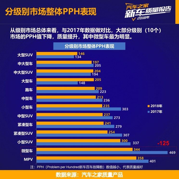 根据车质网今年1-9月的投诉排行榜来看,投诉数量前20名的车型中有13款均为10万出头的车型,而12款均为合资紧凑型轿车。不过综合同期销量来看,反而是其它5款价格超过20万的车型的销量投诉比更加高。而且根据汽车之家2018年年度乘用车新车质量报告的数据来看,分级别市场整体PPH表现中紧凑型车和小型车的排名也高于紧凑型SUV和小型SUV和中型SUV,虽然不见得说十万块的车质量一定优于二十万的车,但是二十多万的车质量比十多万的车更好这个说法也不能成立。