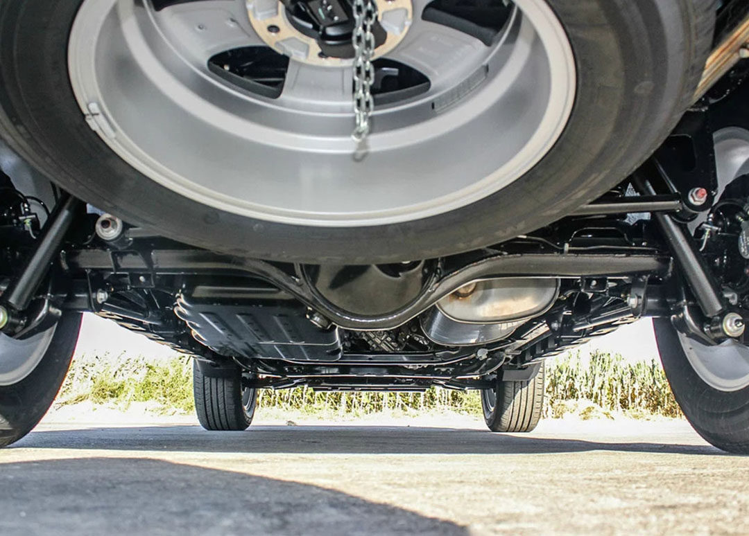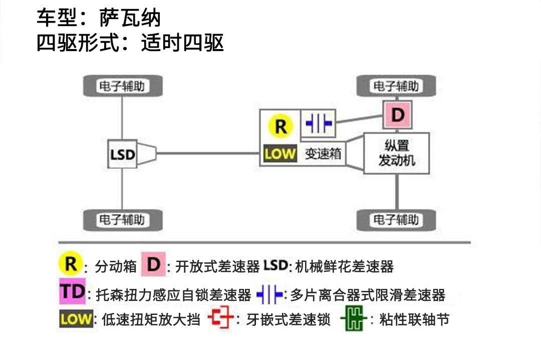 萨瓦纳搭载了一套由博格华纳提供的TOD适时四驱系统,中央限滑差速器为电控多片离合器结构。系统提供2H/4H/4L三种模式,2H模式下为纯后驱状态,四驱模式下可以实现50:50的前后轴动力分配。此外,高配车型还可以选装后轴LSD限滑差速器。
