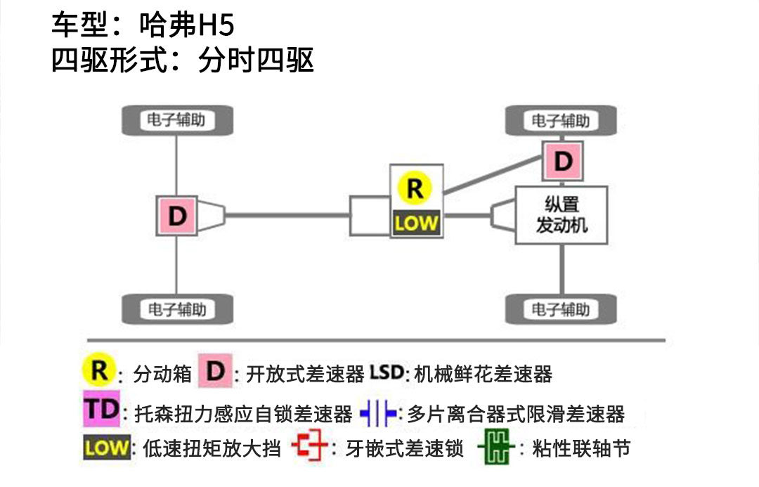 哈弗H5搭载了一套电控分时四驱系统。系统提供2H/4H/4L三种模式,2H模式下为纯后驱状态。另外可以选装后桥差速锁,费用为2000元。