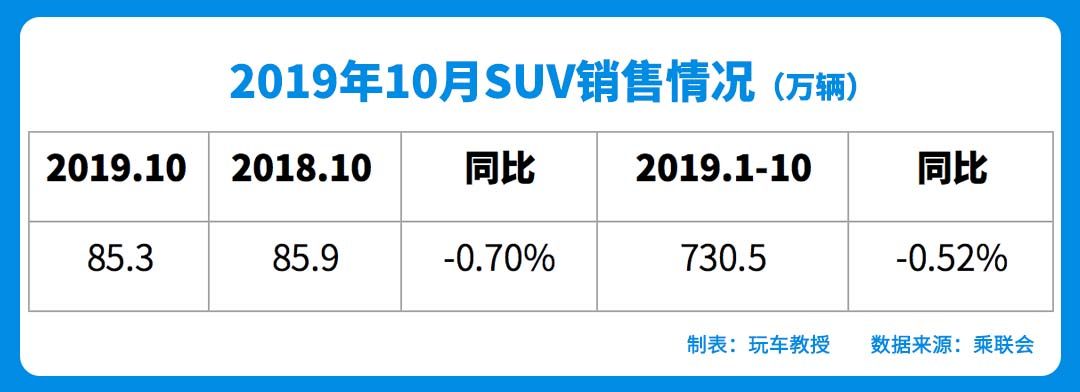 从SUV细分市场来看,10月份SUV销量为85.3万辆,同比下降0.7%,环比增长5.5%;1-10月累计销量730.5万辆,同比下降5.2%。从数据来看,SUV前10月累计销量虽然呈下降的态势,但是当月的销量已基本与去年同期持平,回暖的迹象初现。