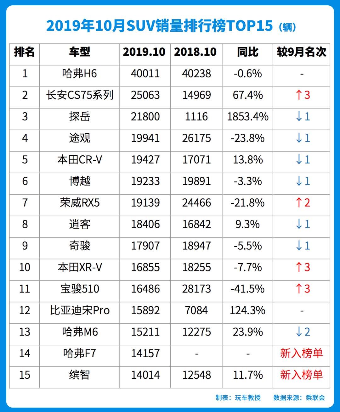 从这份榜单我们可以看到,前15名的竞争异常激烈,共有13款车型名次发生了变化,其中哈弗F7和缤智是新入榜的车型;哈弗H6继续稳坐第一,销量突破4万辆;探岳继续稳坐合资SUV第一的宝座,销量较去年同期增长1853.4%;长安CS75、本田XR-V和宝骏510的排名上升最快,较9月份上升了3位。