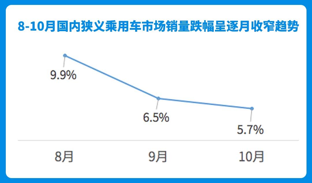 据乘联会最新的数据显示,10月份国内狭义乘用车市场销量为184.3万辆,较去年同比下降5.7%,1-10月累计销量为1662.6万辆,同比下降8.3%。从目前的数据来看,国内整体车市依然处于下行期,但跌幅从8月份的9.9%下降到10月份的5.7%,呈逐月收窄的趋势。
