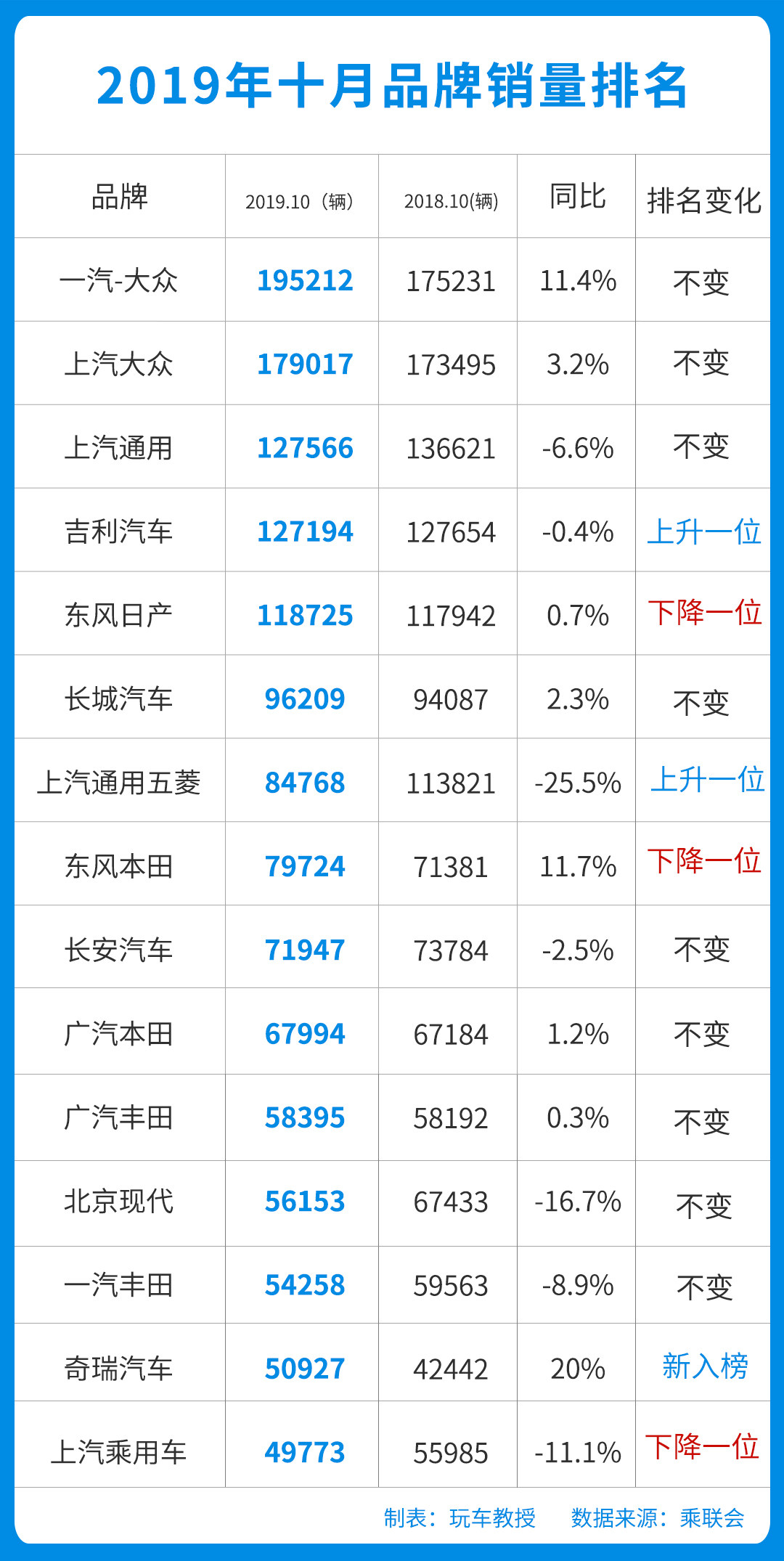 根据乘联会数据,教授整理出10月份各个品牌的销量TOP15榜单,一起来看看都有哪些变化吧?