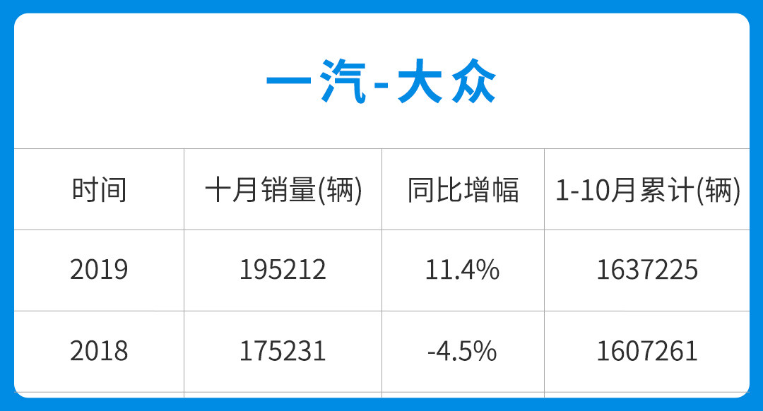 用稳字来形容一汽-大众相信再贴切不过,10月份一汽-大众的销量达到了195212辆,稳定的销量让它从年初霸榜到年尾。从前10个月累计销量来看,不出意外的话年度冠军的宝座也非一汽-大众莫属了。