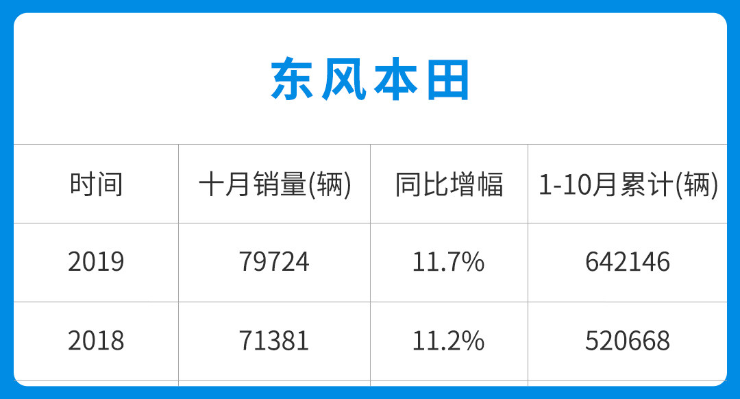 东风本田10月份销量为79724辆,同比增长11.7%;1-10月累计销量则是642146辆,同比增长23.3%。东风本田的猛涨势头与其在轿车、SUV领域双丰收有关,思域以其运动的外观,在年轻市场颇受欢迎;SUV榜,CR-V和XR-V依然坚挺。