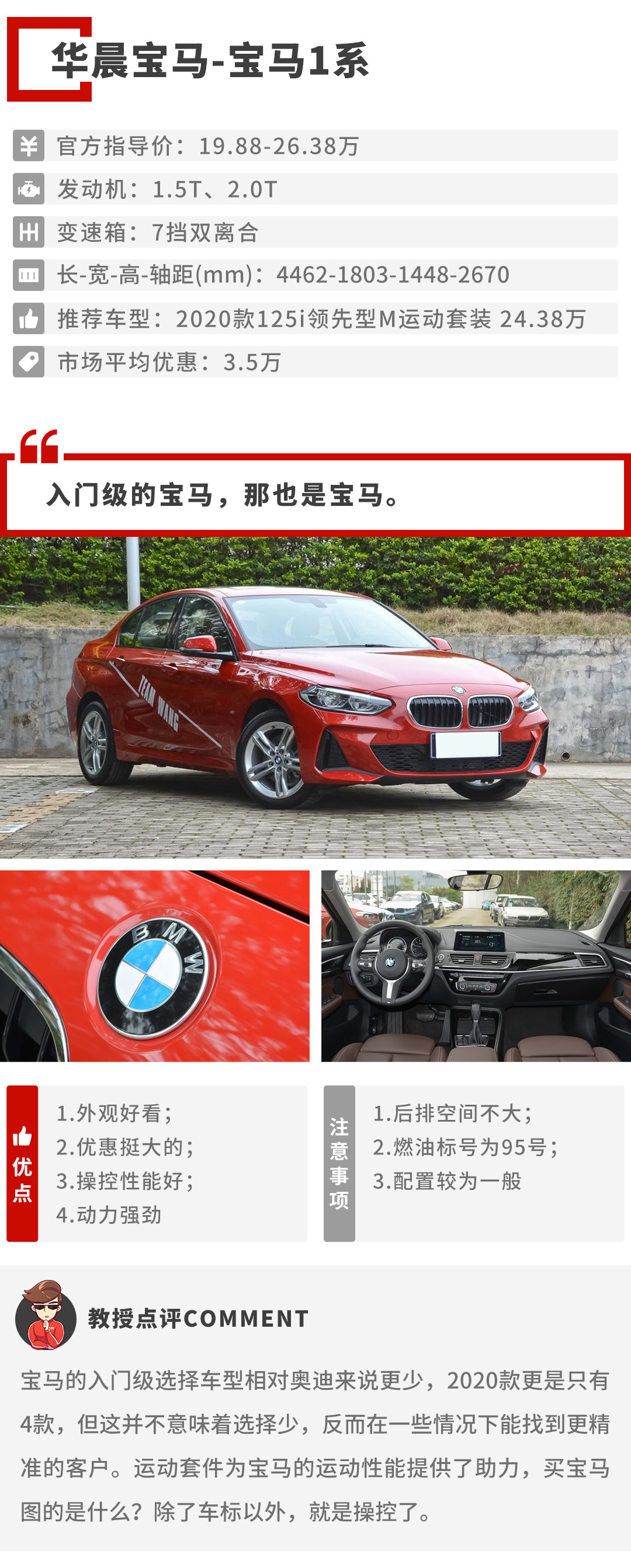 相对来说,宝马1系的车型可选择就少得多。全系只分1.5T和2.0T两种动力,总共4款车型,但相对对应的受众定位更加清晰准确。