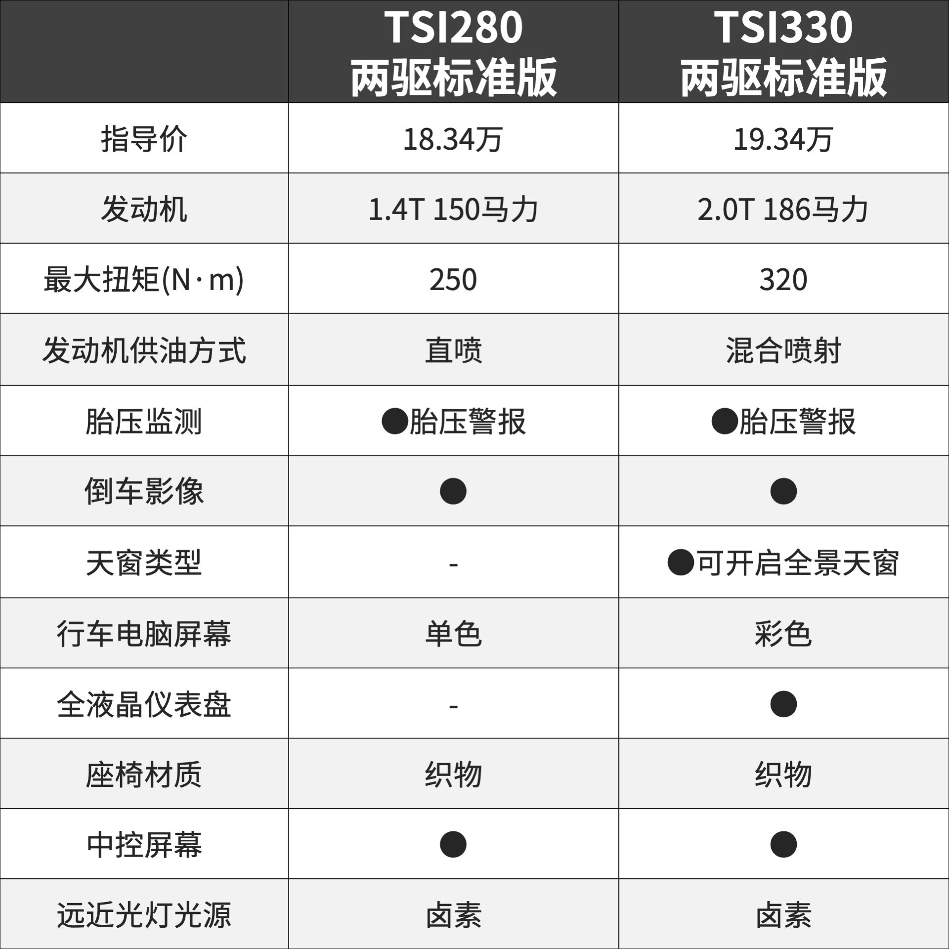 作为售价最低的车型,18.34万元的价格看起来非常吸引,更别说目前全系都有1-2万元的优惠。不过如果将它与售价19.34万元的TSI330两驱标准版比较的话: