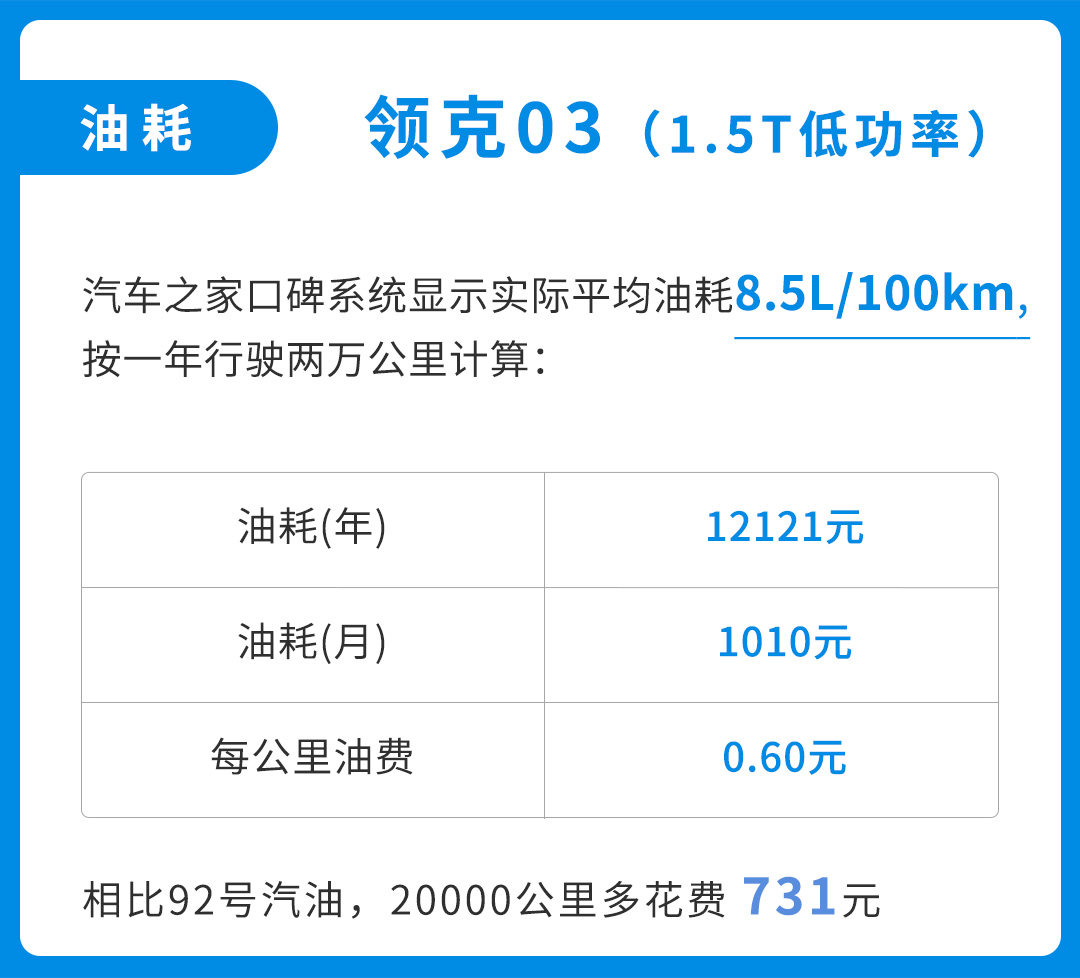 从领克01到领克03,领克家族的每款车型都是95号油的死忠粉,是的,想买到一台烧92号油的领克是不可能的。由于领克01/02/03车型的动力总成都相似,我们也能从领克03这款车映射到领克整个品牌上。
