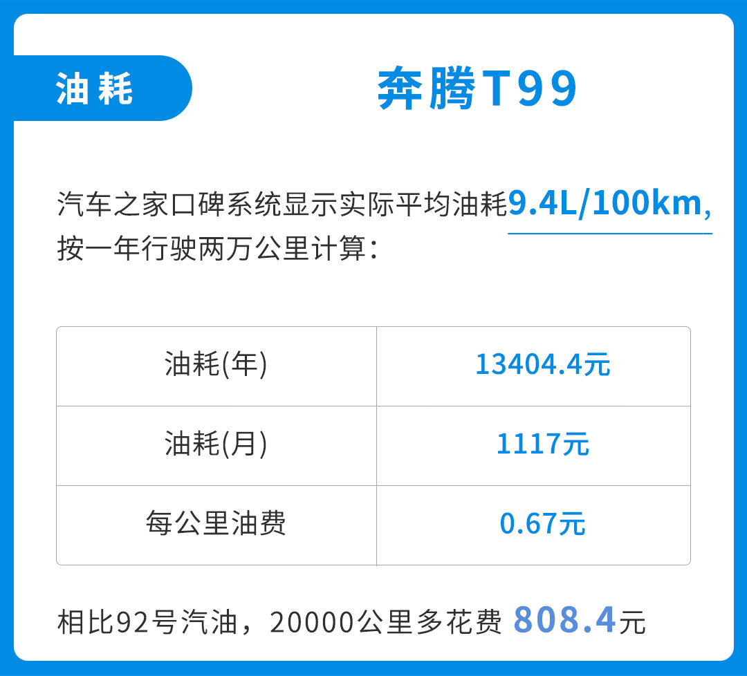 虽然压缩比不是判断加注燃油标号的唯一标准,但奔腾T99高达11.5的压缩比和燃油标号同样脱不开关系,高压缩比发动机需要抗爆性更好的汽油,以此达到充分的燃烧效率。因此,虽然奔腾T77的燃油经济性变得更好,但加95号油要花的钱也更多了。