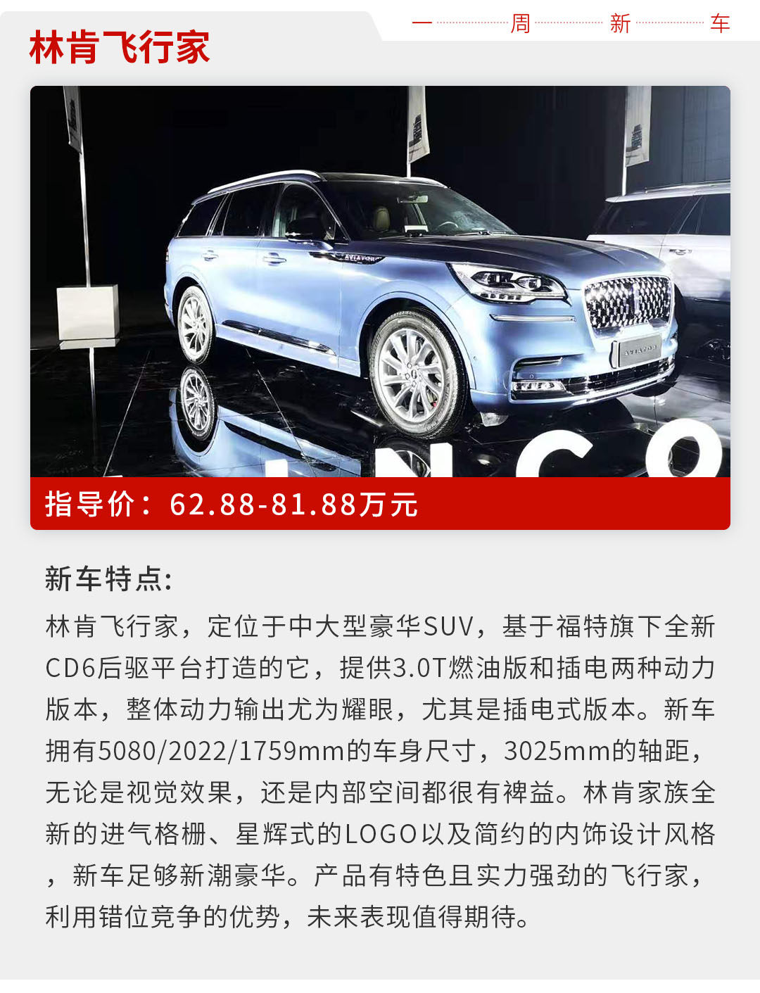 可能是临近一年一度的广州车展的缘故,本周上市新车虽然数量较多,但在很大程度上都是一些小改款车型或是一些新增配置车型。不过也有一些全新车型的加入,比如林肯飞行家中大型豪华SUV,用更高动力版本和更加亲民的价格向中大型豪华SUV车型发起挑战;赛麟迈迈定制版的推出,开启赛麟在华之路。话不多说,马上开始我们的一周新车时间!