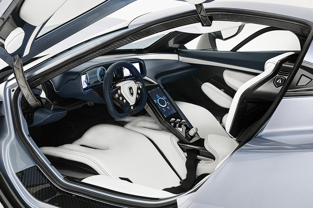 既然是彰显未来科技的车辆,内饰也必须贴合科技,车内使用三块液晶显示屏,分别显示车辆的状态、导航系统、功能性操作三大部分。Aspark Owl的座椅使用碳纤维骨架,配合白色皮革,高级感十足。还有一个细节,座椅的角度极其夸张,可以想象,人坐在里面以后臀位相当低矮,更加像方程式赛车的坐姿。同时,车内还配备防滚架,配合上碳纤维车顶大大提升乘员的安全性。