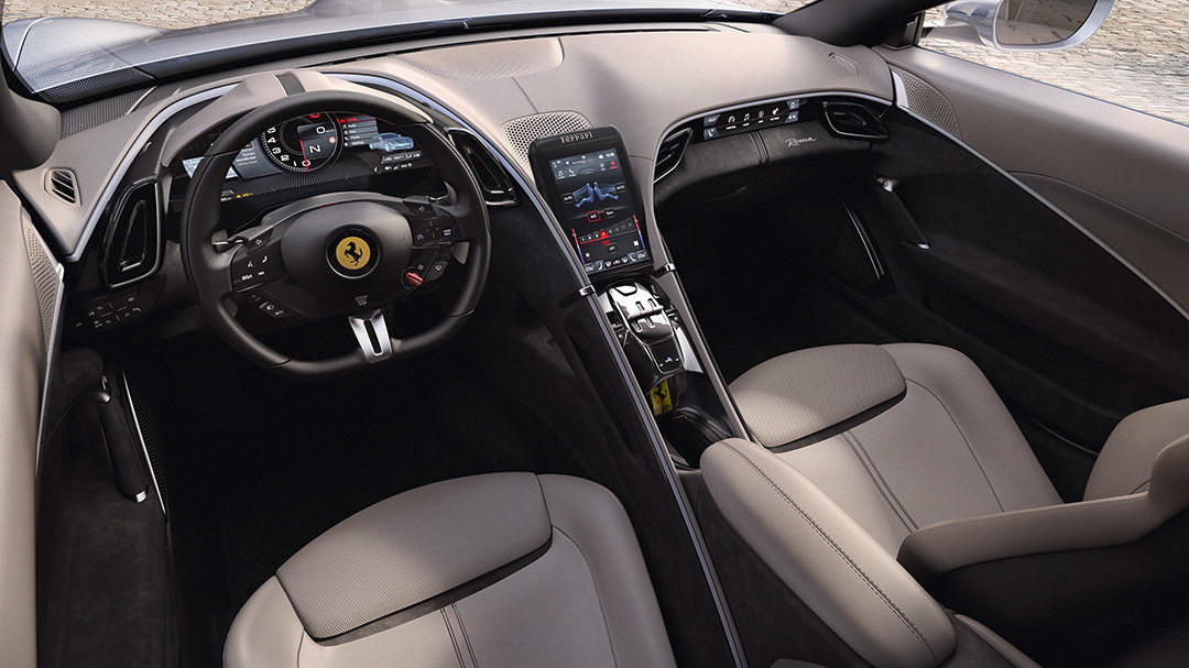 Roma的中控台配备了16英寸曲面全液晶仪表盘,中央区域有一块纵向放置的中控屏,副驾驶位置前方的副显示屏显也可显示相关行车信息,三块显示屏有效提升了座舱的科技感。同时Roma的换挡机构与SF90 Stradale的样式完全相同。