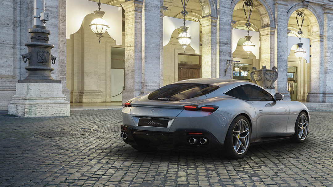 Roma的外观不遵循以往任何一部法拉利的设计语言,整车造型简洁流畅,车头修长,车尾紧俏,前后灯组用了极简的线条勾勒。有一些独特的细节:前格栅与车身同色,并大角度前倾,车门为隐藏式设计,配备双边四出的排气口。