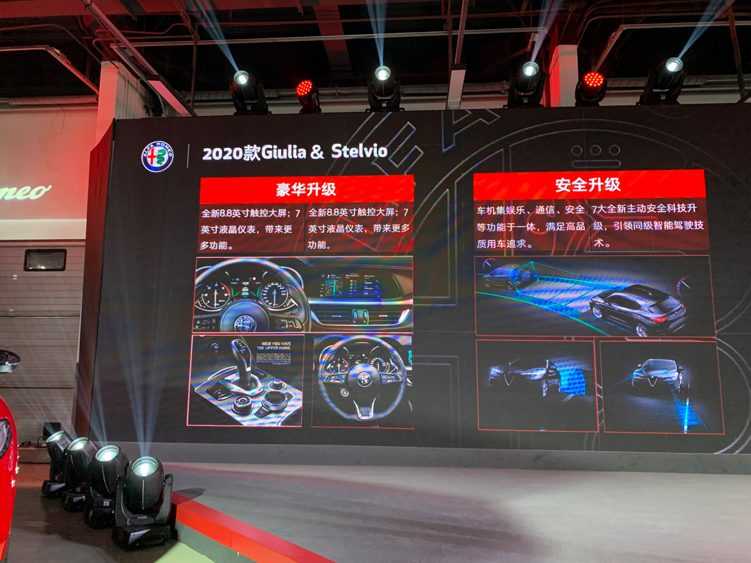 此次上市的2020款阿尔法·罗密欧Giulia和Stelvio车型延续了旧款车型的外观设计,但在赛道限量版车型上增加了专属风格的车身贴花。两款新车主要在内饰和配置上进行了更新,中控台更改为向驾驶员倾斜的样式,配置方面增加了8.8寸中控屏、7英寸仪表盘行车电脑显示屏、真皮换挡杆、车联网系统、无线充电、主动安全系统等。