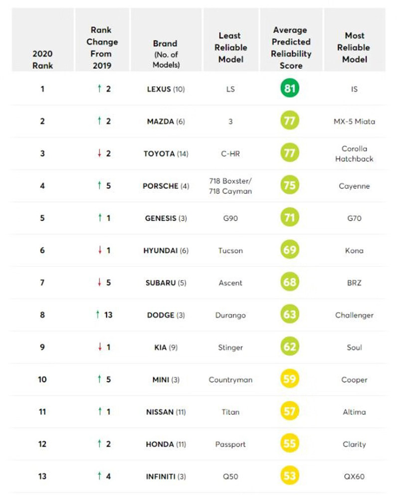 《消费者报告》公布了2019年度汽车品牌可靠性排行榜,基于42万辆汽车数据得出。其中雷克萨斯再度登顶,马自达居第二,丰田降至第三,保时捷排名第四,五六名分别是捷尼赛思(捷恩斯)和现代;斯巴鲁狂跌5名排在第七;道奇凭借优异表现上升到第八;第九名是起亚,第十名是宝马集团子品牌MINI。