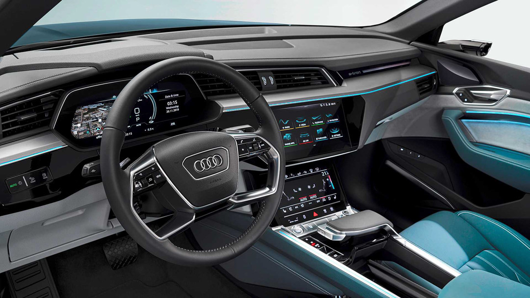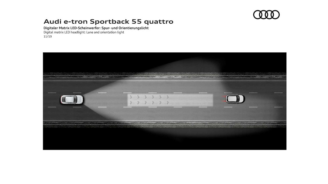 E-Tron Sportback还配备了“百万像素数字矩阵LED大灯”,没错,灯厂又革新了技术。这款听起来相当唬人的大灯内置了100万个发光点,每秒可以实现5000次的明暗控制,它可以在车辆前方投射出各种图像,建立更丰富的与交通参与者的对话方式,精确控制照明范围更是基础功能。