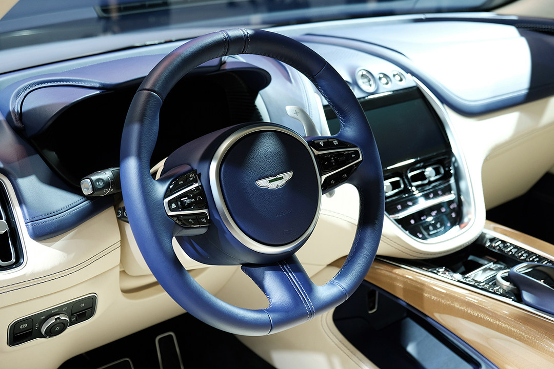 DBX作为阿斯顿·马丁旗下的车型,其内饰设计当然也与同品牌跑车一样带有一种特别的运动豪华风味。在中控台、仪表盘、方向盘等部分,DBX都采用了与其跑车兄弟类似的设计风格;不过由于这是一款SUV,座舱更高大,使DBX的中控台更显厚实,而中控屏幕也不像DB系列一样采用悬浮式设计,而是镶嵌于中控内。