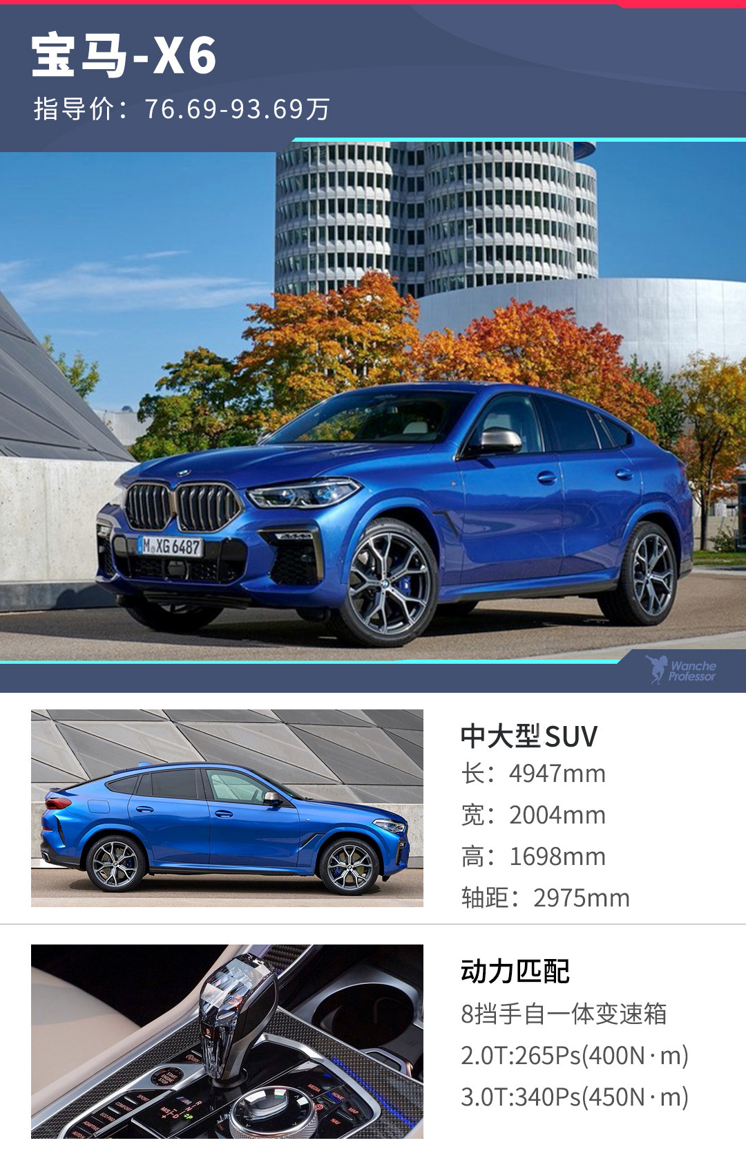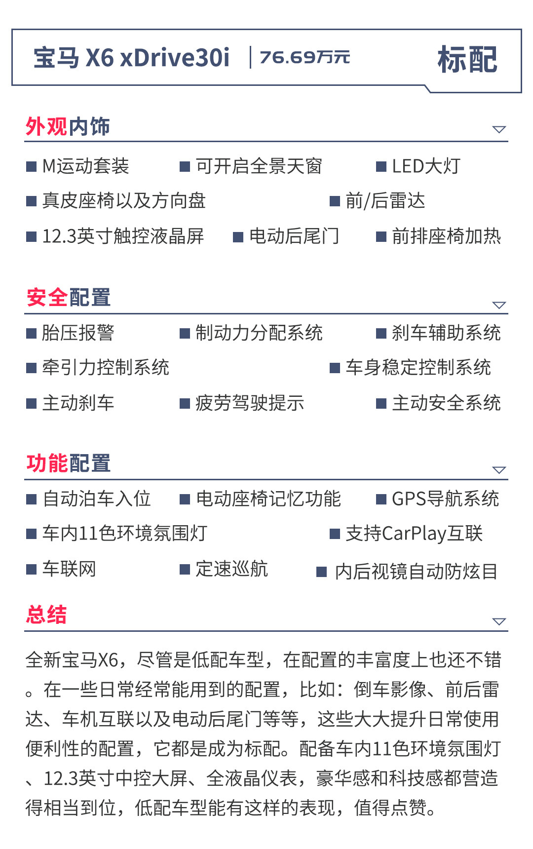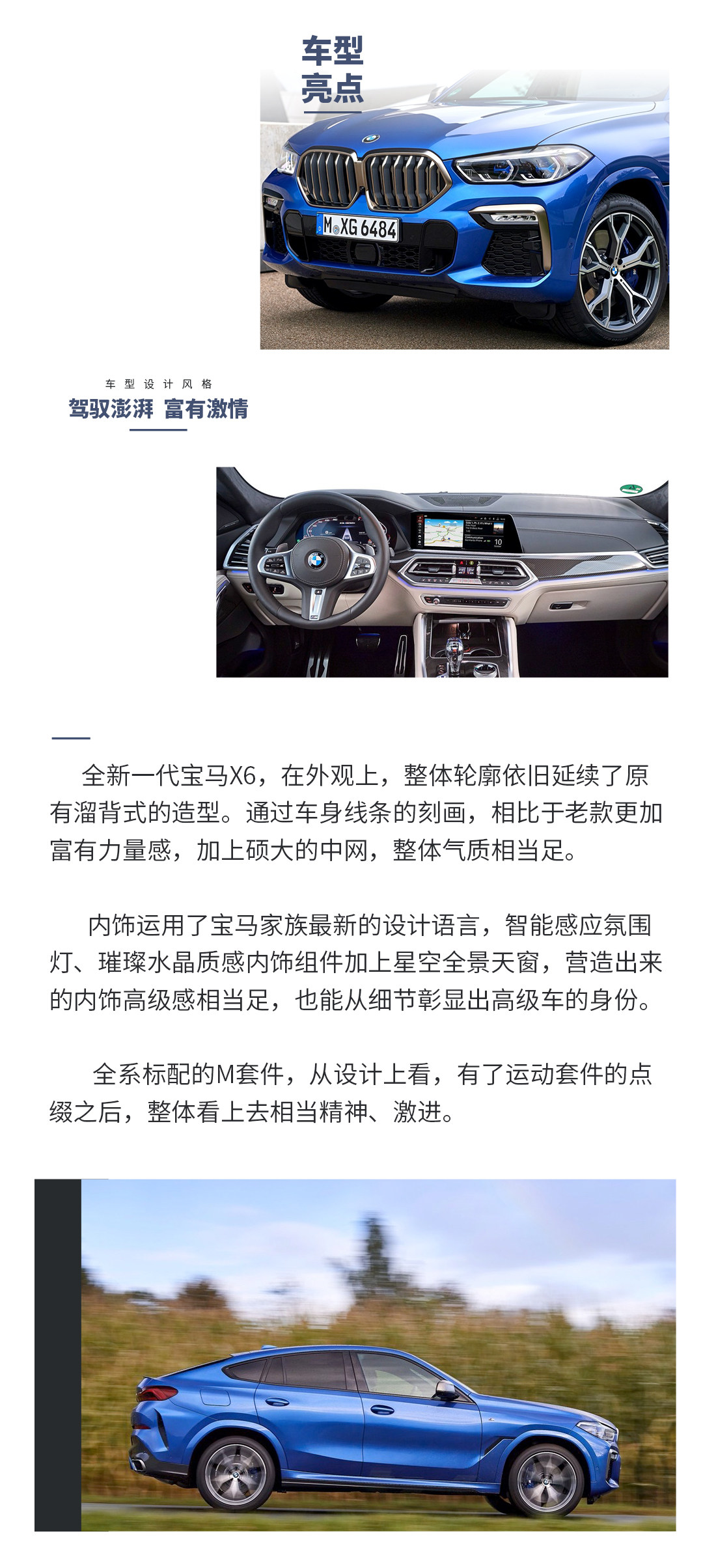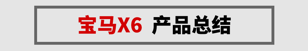 全新的宝马X6,整体的综合表现是相当不错的。霸气、激进的外观,豪华的氛围,加上丰富的配置,都是促使你刷下银行卡的根本原因。但还是需要注意的是,相比于同级别对手,在空间上的表现,明显是它的一大劣势,特别是在后排,头部空间以及腿部空间对于大部分人的体型而言,也仅能是够用级别。但是,如果说空间不是你所考虑的因素,就不用思考了,按照自己合适的配置,买它!
