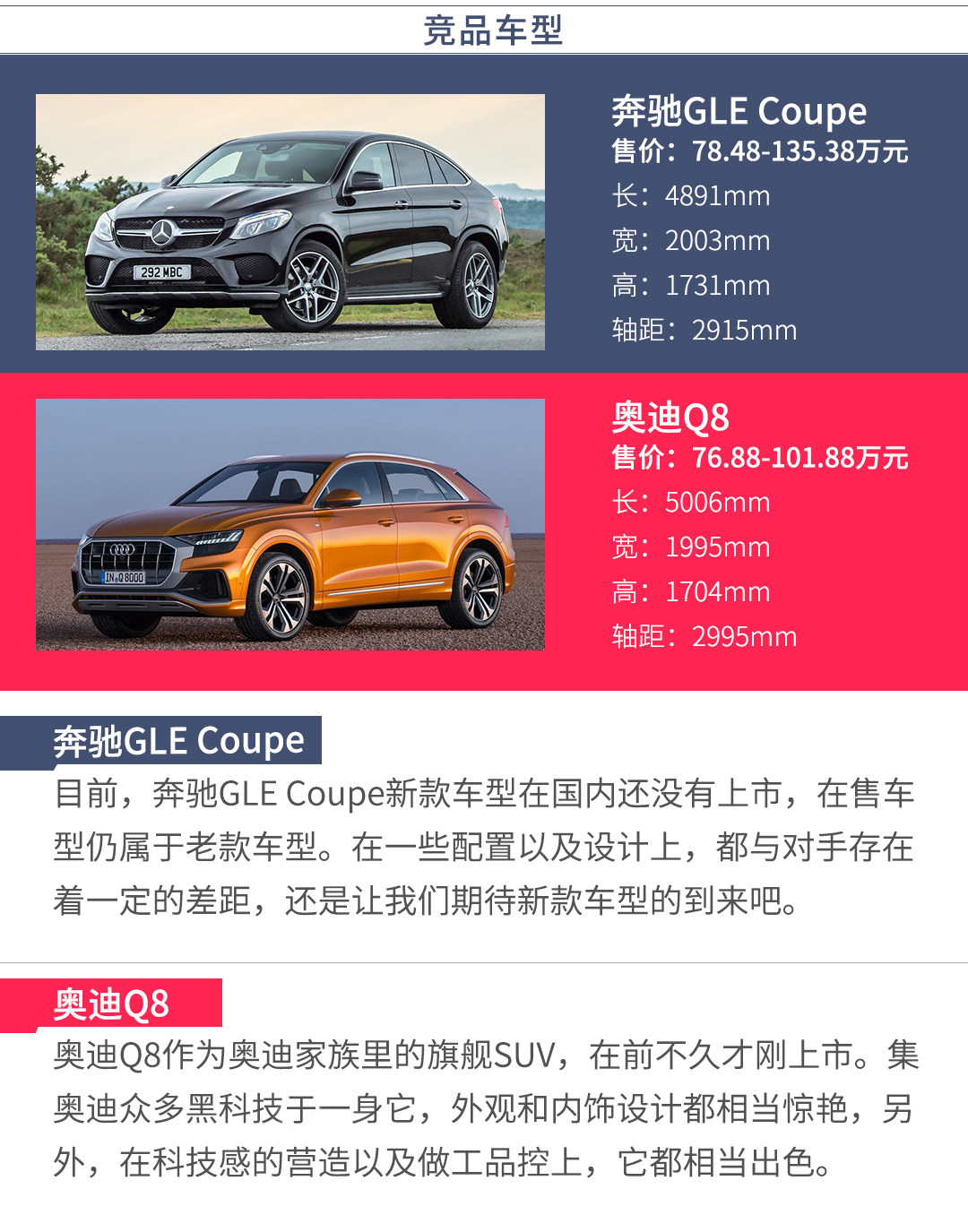 对于奔驰GLE Coupe在这我就不多作评价了,毕竟不是一个年代的产品,而它也将近要换代,没啥好说的。看过来Q8这边,同为新款车型,都是溜背式的造型,都有着运动、激进的外观,但其实两款车的性格取向却截然不同。奥迪给你的感觉就像是一个乖巧的小秘书,她能按部就班的完成你给她的所有任务,并不会出什么差错。体现运动的加速性能,过于平稳的感觉时间长了不免让人感到乏味。宝马X6则是与它相反,出色的动态表现,“调皮”的小尾巴总能让你惊慌失措,正是这种让人不放心感觉,才能促使你更专心的驾驶它,征服它。