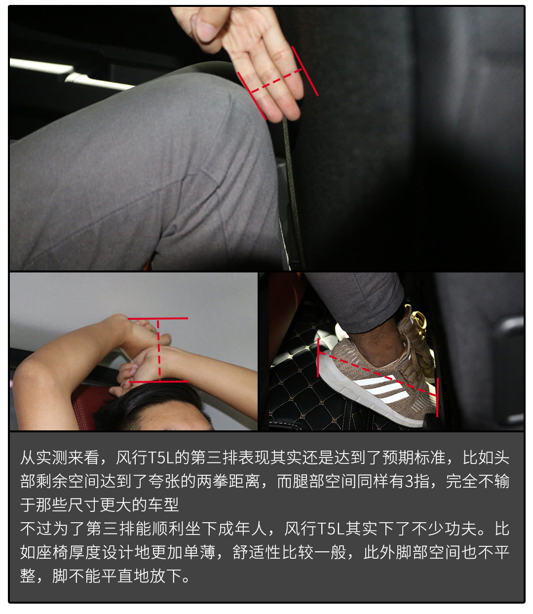 作为风行T5的加长版本,风行T5L的车身尺寸还是比较紧凑的,长宽高分别为4780/1872/1760mm,轴距为2753mm。因此,在较为紧凑的车身中如何塞进第三排座椅,就成了一大考验。