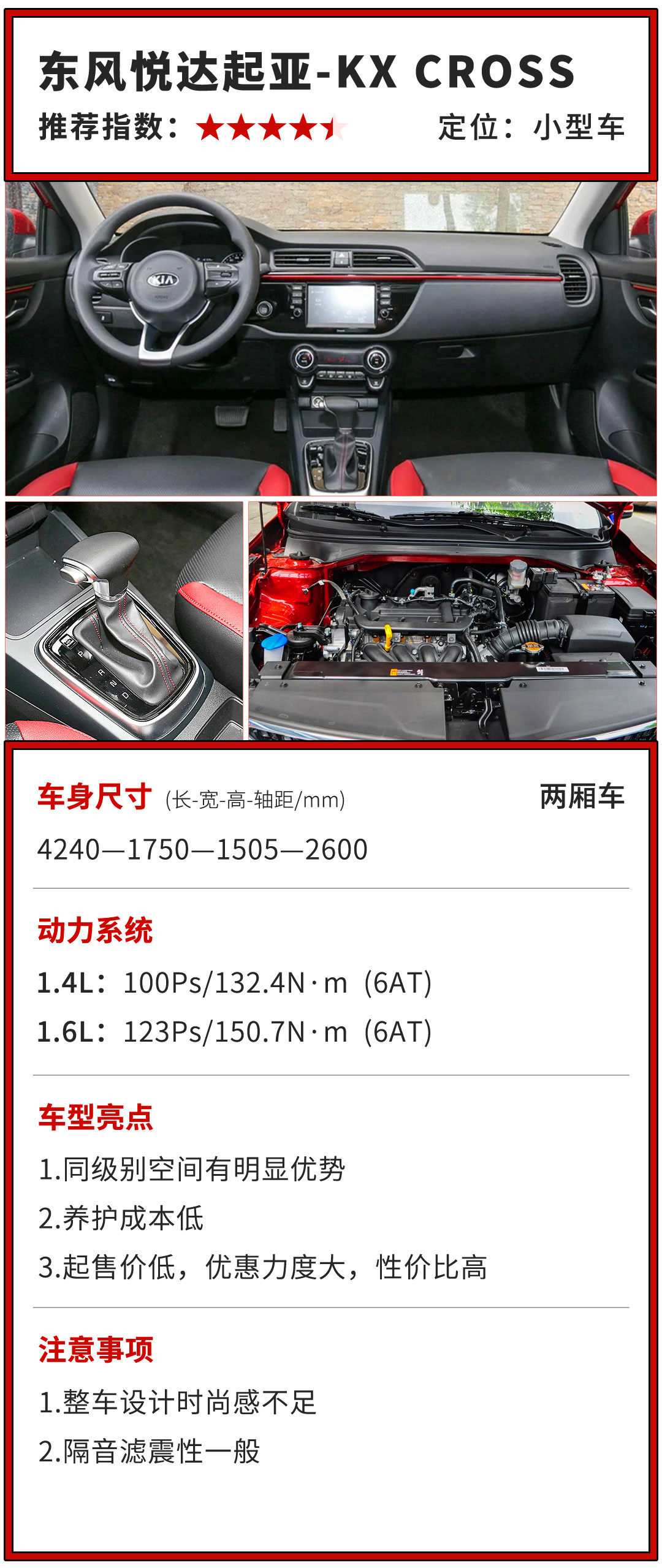 起亚KX CROSS主打低价大空间的高性价比。起亚官方虽把其定义为小型车,但KX CROSS在跨界套件的加成下,就很像被改装了宽体风格,主观视觉感受一点不显小。而其实际外形尺寸也接近紧凑型车的水准,车内乘坐和装载空间超越同级绝大多数对手,可以说是一款“准紧凑型车”。