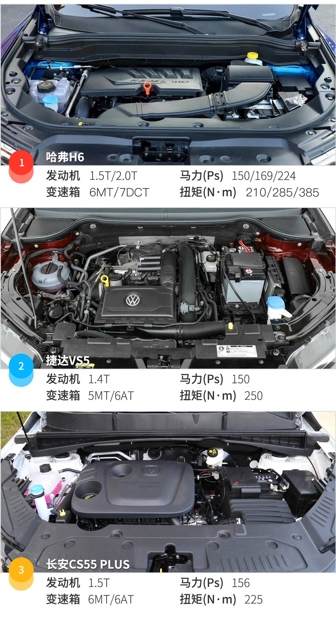 既然是满足日常代步和家用定位的紧凑型SUV,那么三款车自然也是采用偏向成熟可靠的动力方案。如图所示,三款车都搭载了涡轮增压引擎,并采用当下流行的1.4/1.5黄金排量,其中H6匹配自家成熟的7速双离合变速箱,而另外两款车的6AT自动变速箱则来自爱信。另外,哈弗H6还提供了最大马力224匹的2.0T“大排量”版本,动力感受相比另外两款车要强不少。