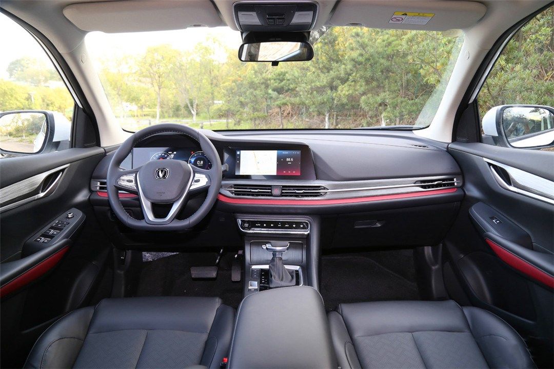 与哈弗H6的轻奢风不同,长安CS55 PLUS的内饰与它的外观一样张扬,采用更能讨好年轻人的运动豪华风,这主要通过运动造型座椅、红色内饰缝线,以及中控+仪表的连屏设计来体现,且大部分车内功能都被集成到中控屏中,我们先不管这样的设计是否实用和存在借鉴的嫌疑,反正真的是很帅。