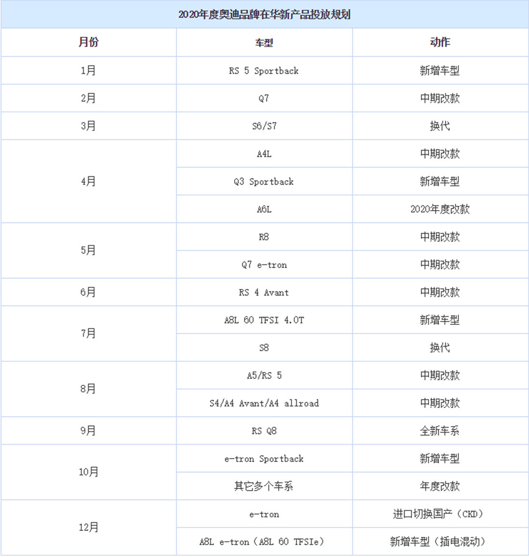 日前,教授获取到了奥迪品牌2020年在华产品投放规划。从图片来看,明年奥迪将在中国市场投放18款车型。由此看来2020年也将是奥迪的产品大年,几乎每月都有新车推出。其中二季度的重磅新车,像新款A4L、Q3 Sportback、新款RS 4 Avant和新款R8等都是非常值得期待的车型。近几年来,奥迪品牌一直在中国市场引进最新车型和小众化车型,使得该品牌在华产品线逐渐丰富、壮大,而且与海外市场逐渐同步。此举也换来了消费者和车迷朋友的一致肯定与赞同。