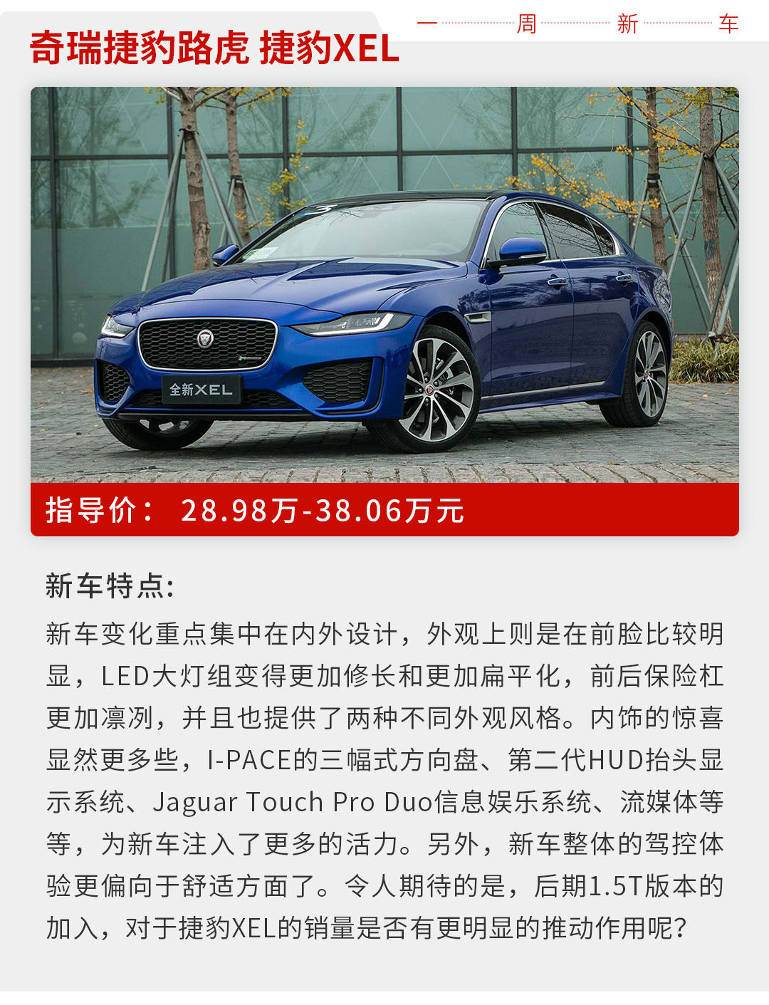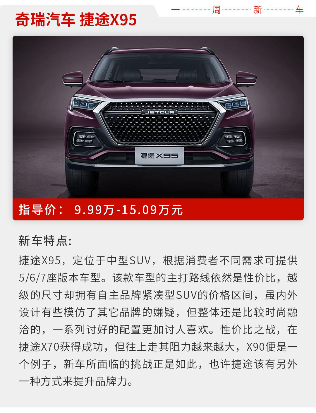 为了提升综合竞争力,各家车企势必会使出浑身解数。比如推出全新的车型,将企业里最新的设计以及最新技术都运用在该款车型;除此之外,中期改款车型也尽量的在进行多方面的优化。本周上市的新车,更加贴合这个主题。捷途X95和长安欧尚X7 作为亲民国产SUV,除了售价有惊喜之外,新车在内外设计以及其它方面等都有较高的水准;皓影的到来,很大概率上将成为广汽本田的摇钱树;而中期改款的捷豹XEL,更加综合更适合大部分消费者。