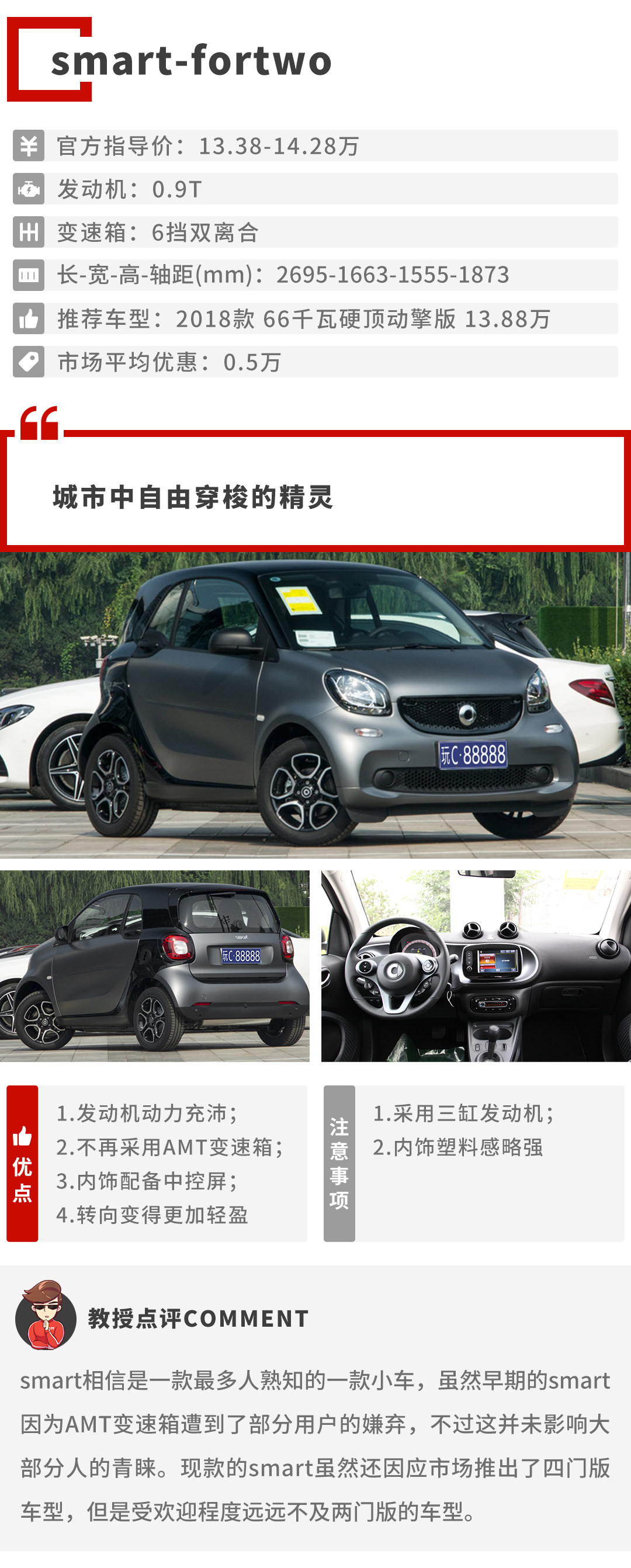 smart凭借小巧玲珑的外观,自上市以来就受到不少年轻人的青睐,只不过当时配备的AMT变速箱则是备受吐槽,不过还好在新款车型上已经有了很大的改变。更圆的外观让整车看起来更加可爱,内饰也变得更加有科技感了,经典的造型也得以保留。不过,smart除此之外还推出了四门版的车型,但是在销量上就有点不够乐观了,像是硬生生将一台三门版车型进行拉长,如果你想要个性的话还是选择三门版车型吧。